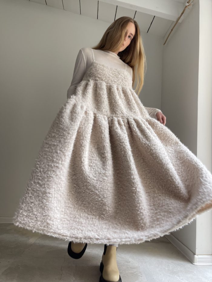 Robe « MINA » en sherpa écru. Bustier de la robe sur élastique, fines bretelles, poches, robe entièrement doublée en voile de coton et soie écru. Une robe élégante et stylée. PIÈCE UNIQUE