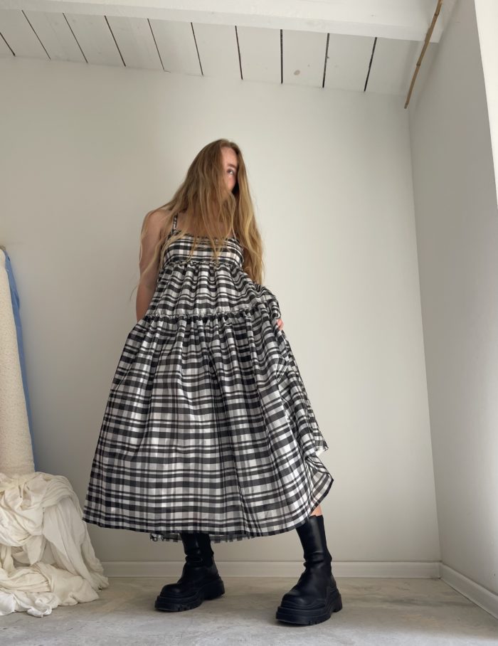 Robe « MINA » dans un magnifique taffetas de soie à carreaux. Bustier de la robe sur élastique, fines bretelles, poches, robe entièrement doublée en voile de coton et soie écru. Une robe élégante et stylée. PIÈCE UNIQUE