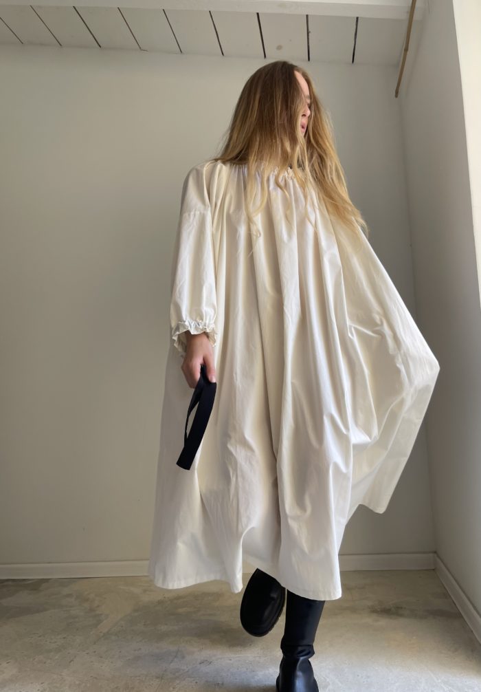 Robe MYA en coton écru, une coupe minimaliste, stylée et élégante. Poignets froncés et ajustable par un ruban en crêpe de soie, col élastiqué et froncé, poches. PIÈCE UNIQUE