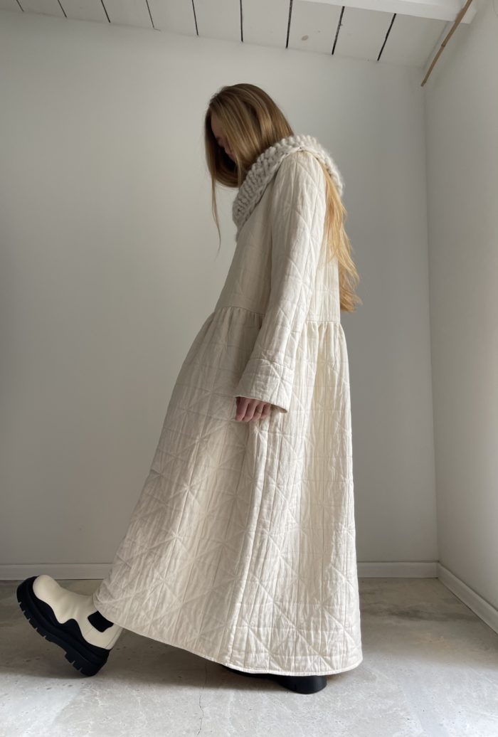 Robe « NINON » en coton jacquard écru. Une coupe minimaliste et élégante. Poches. PIÈCE UNIQUE