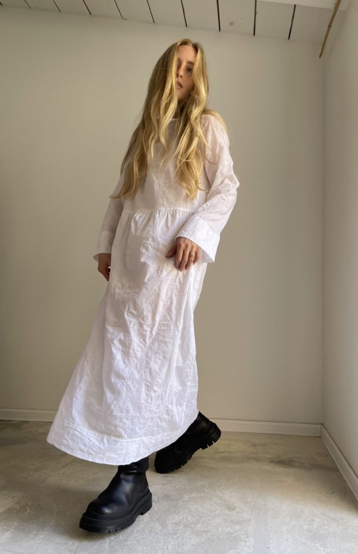 Robe « NINON » en voile de coton façonnée, effet froissé. Une coupe minimaliste et élégante. Non doublée, légèrement transparente. PIÈCE UNIQUE