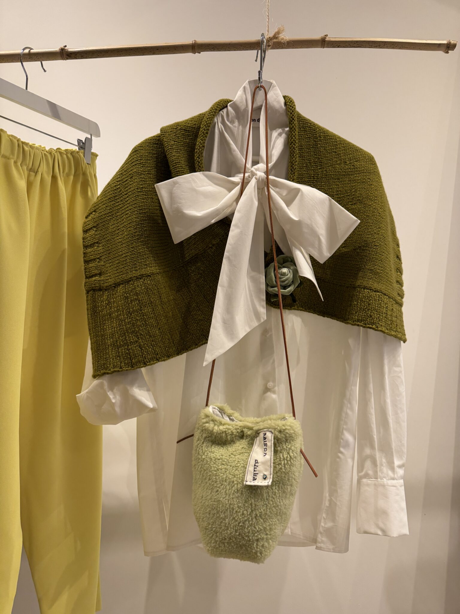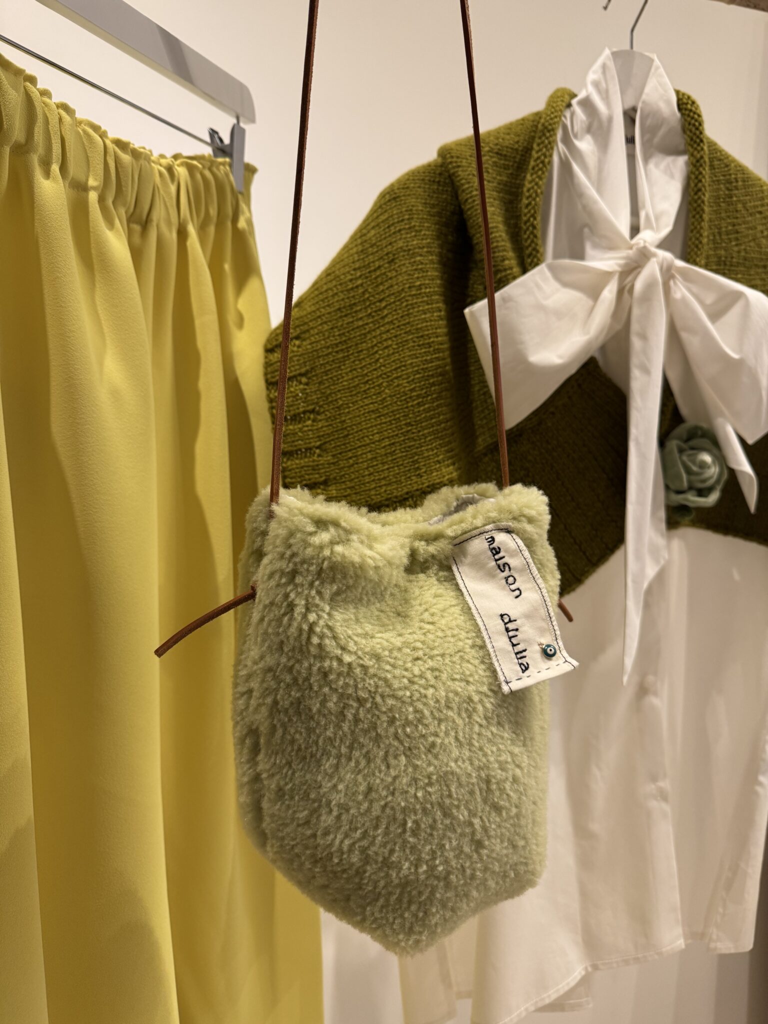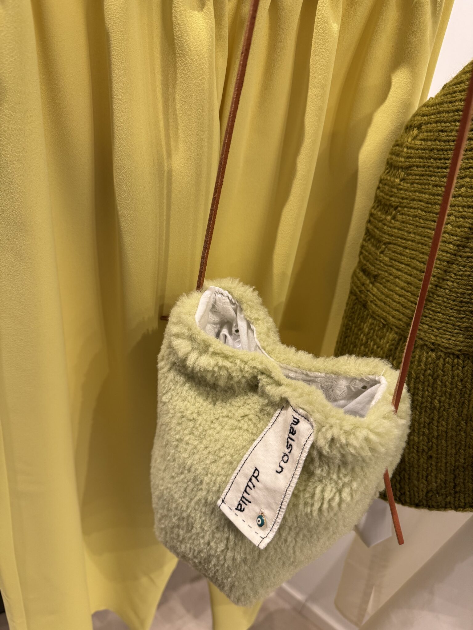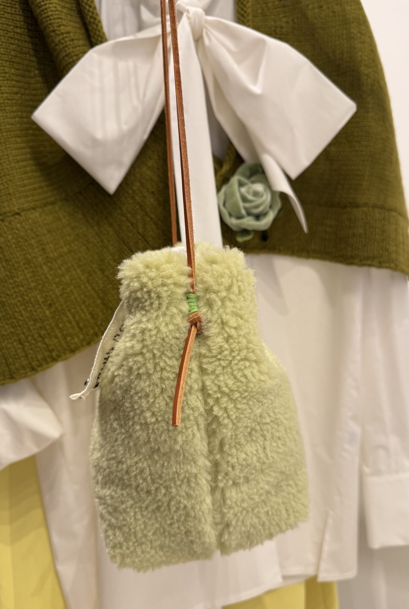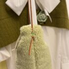 Sac bandoulière en tissu sherpa vert. Fond de sac en coton broderie anglaise. Broderies main. PIÈCE UNIQUE