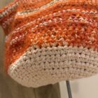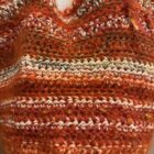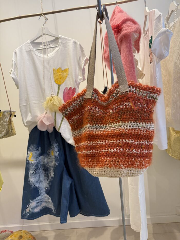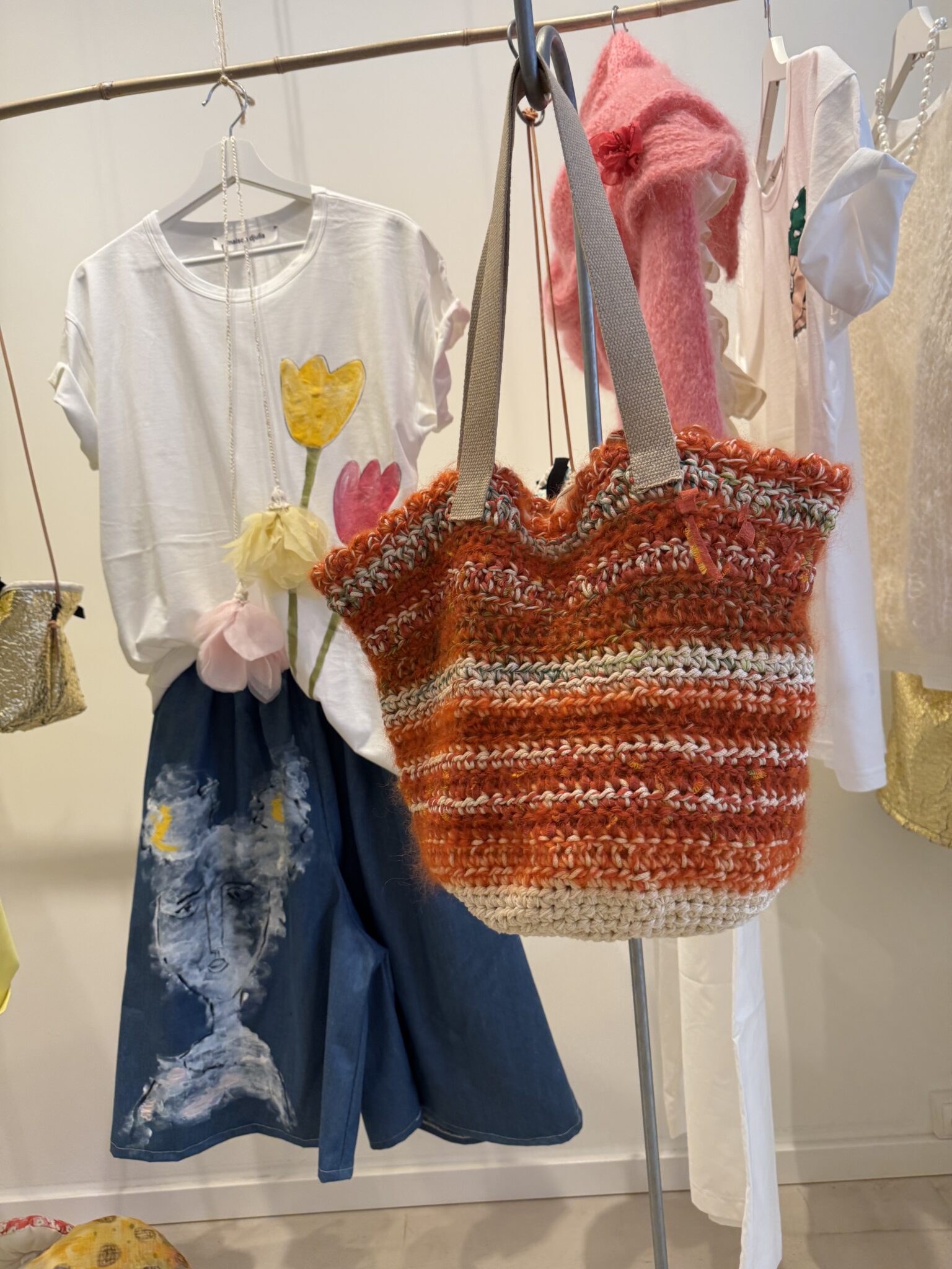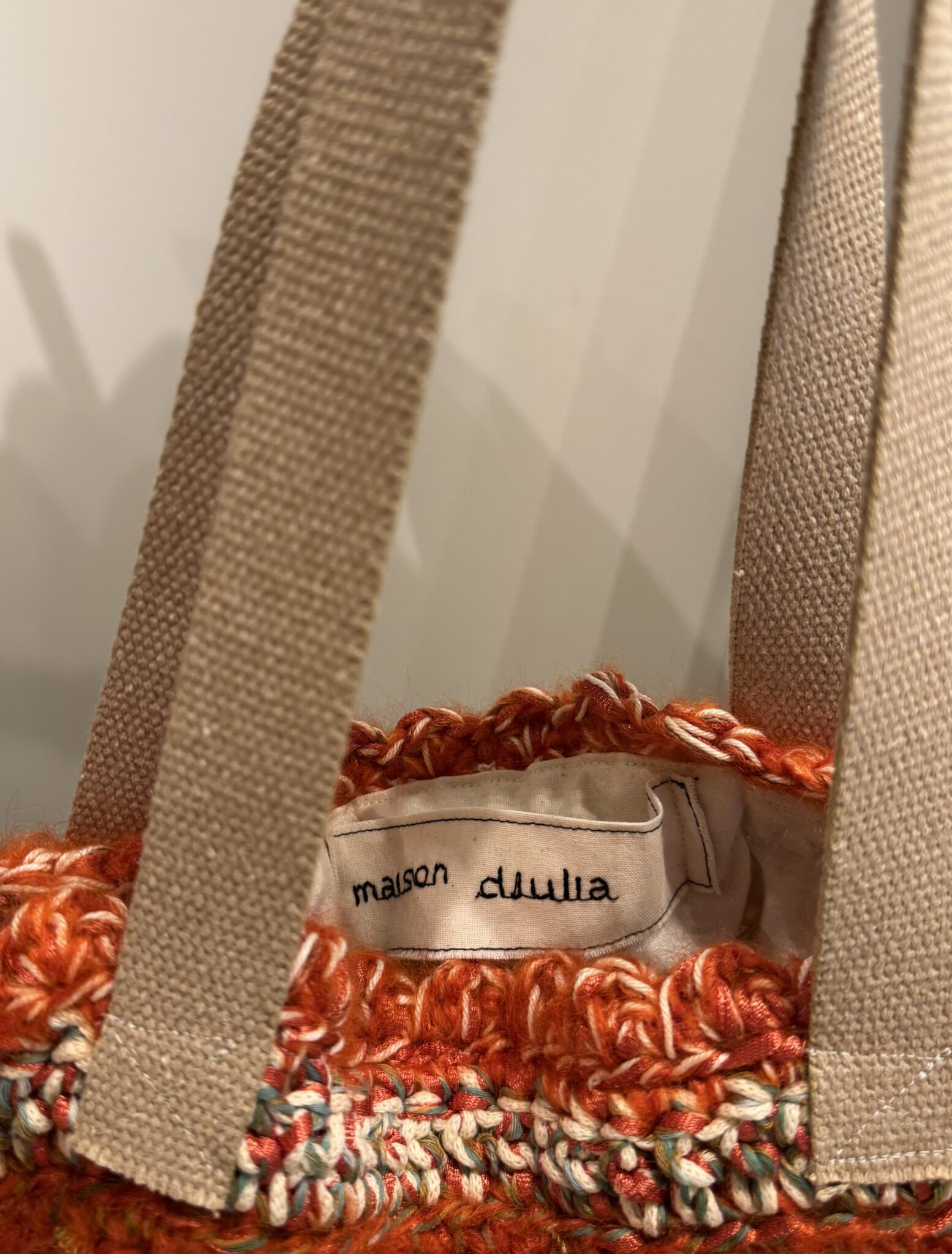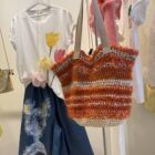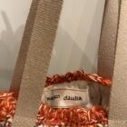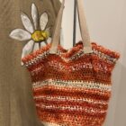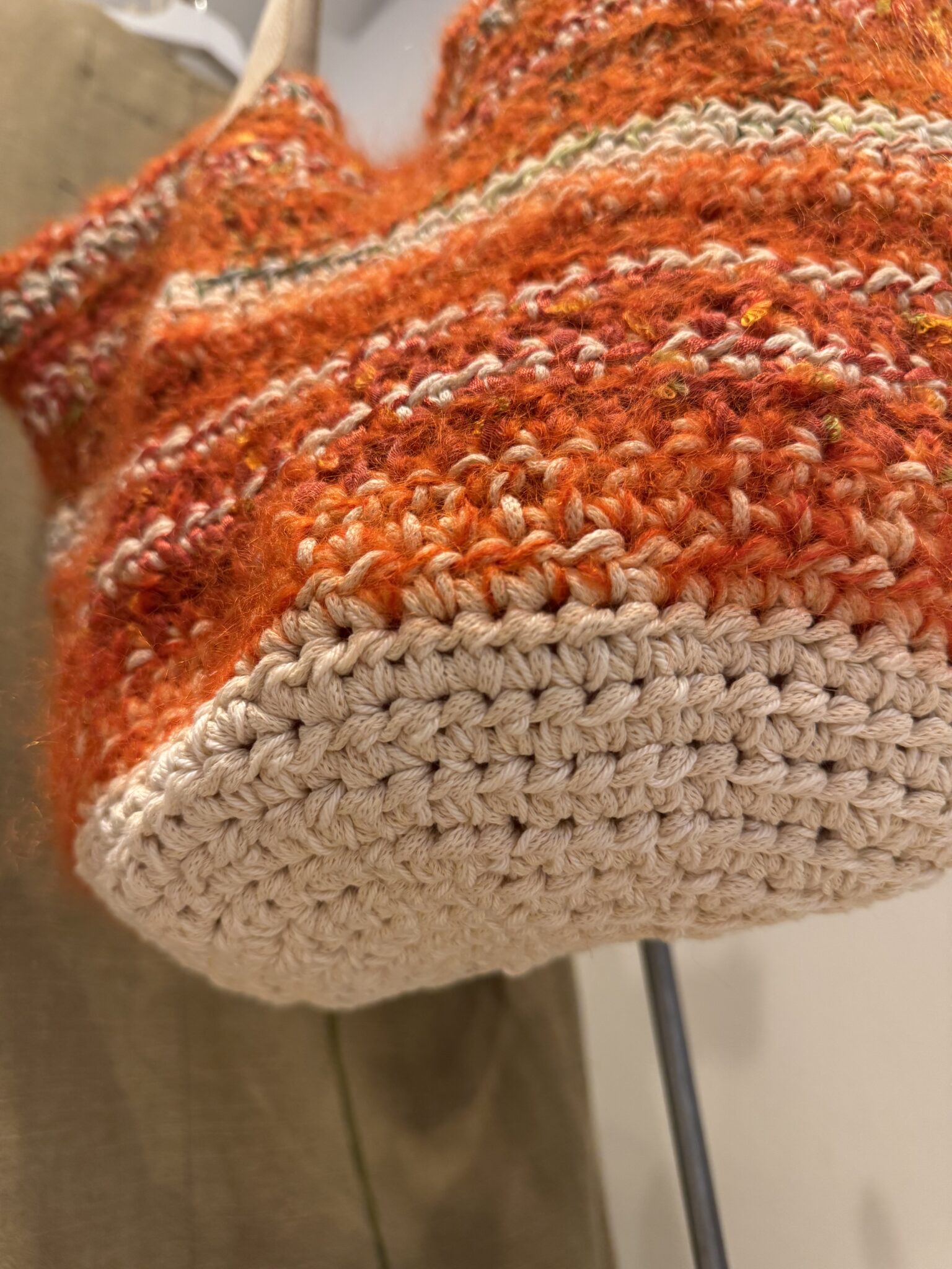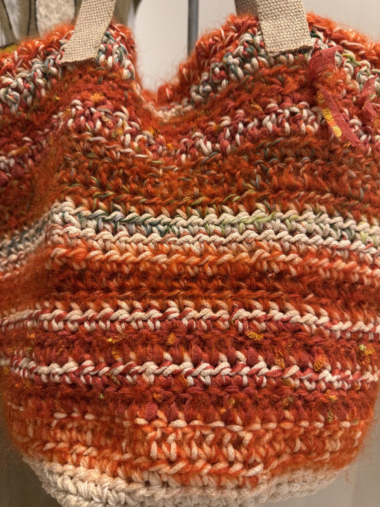 Sac crocheté main, diverses matières, poignées en corde beige, fond de sac en toile à beurre.