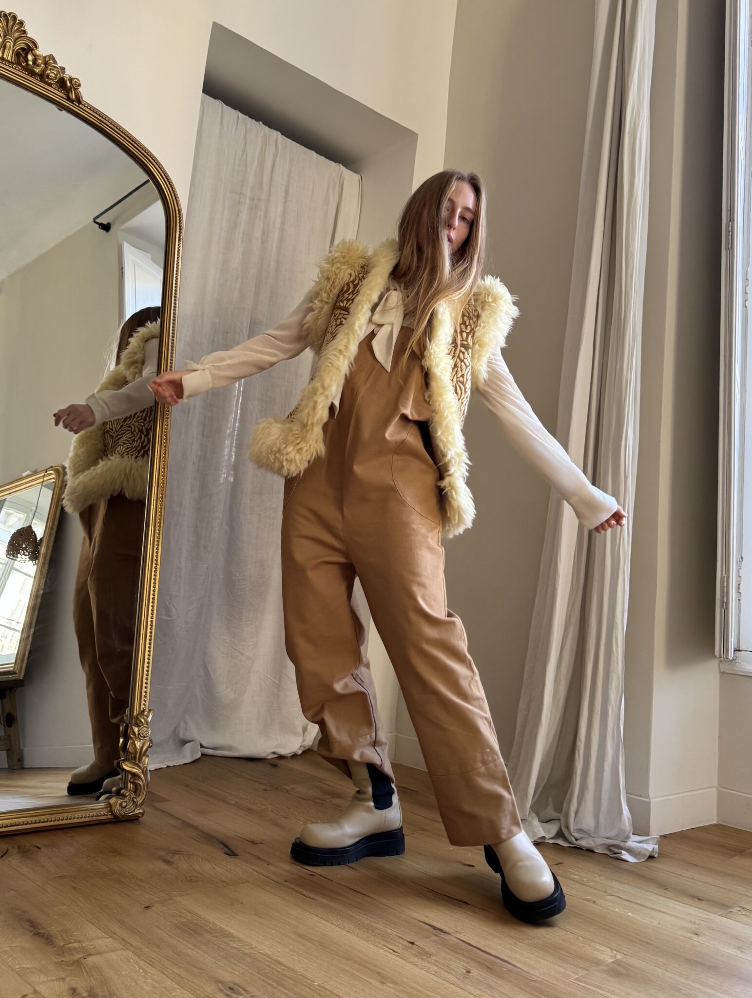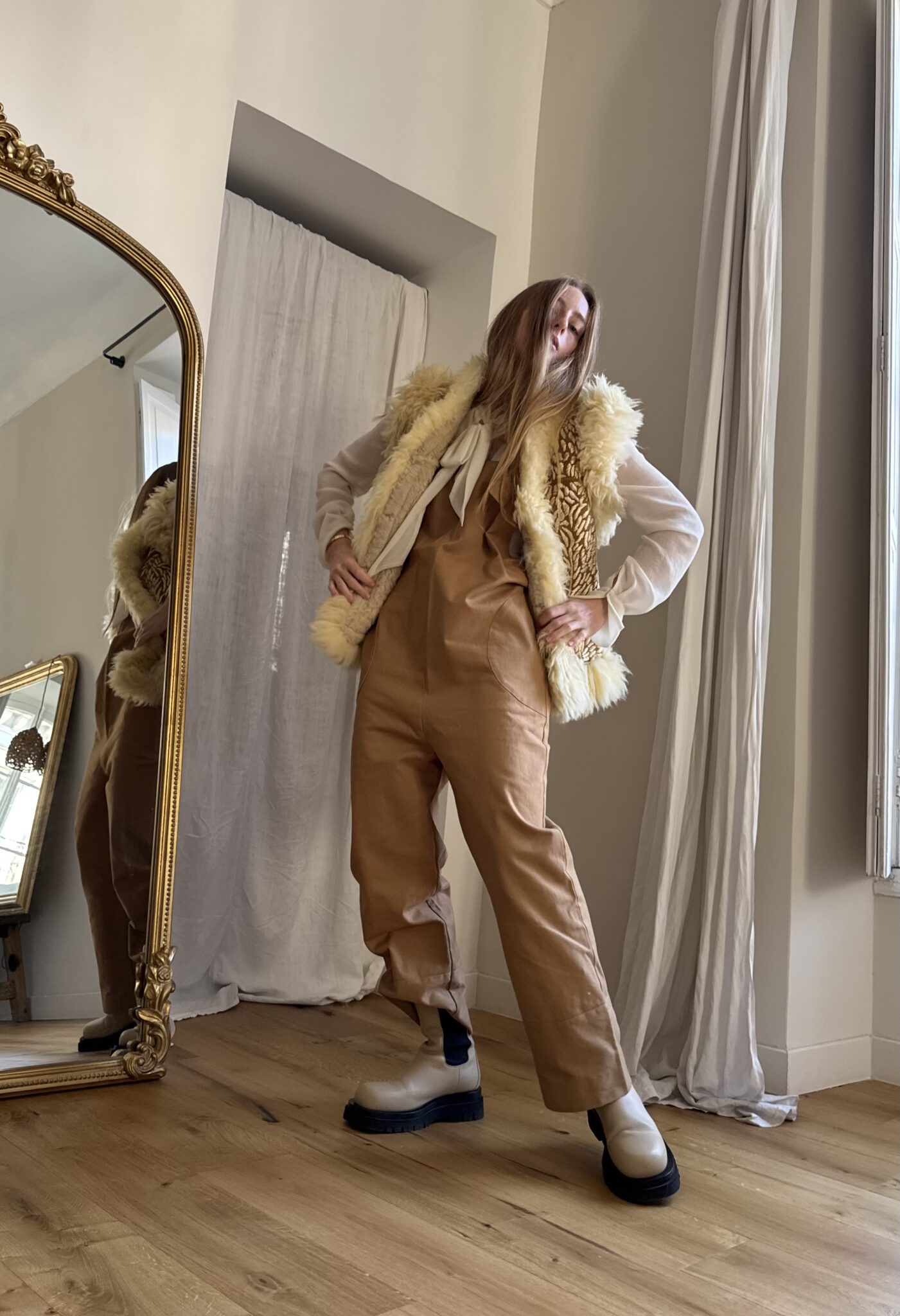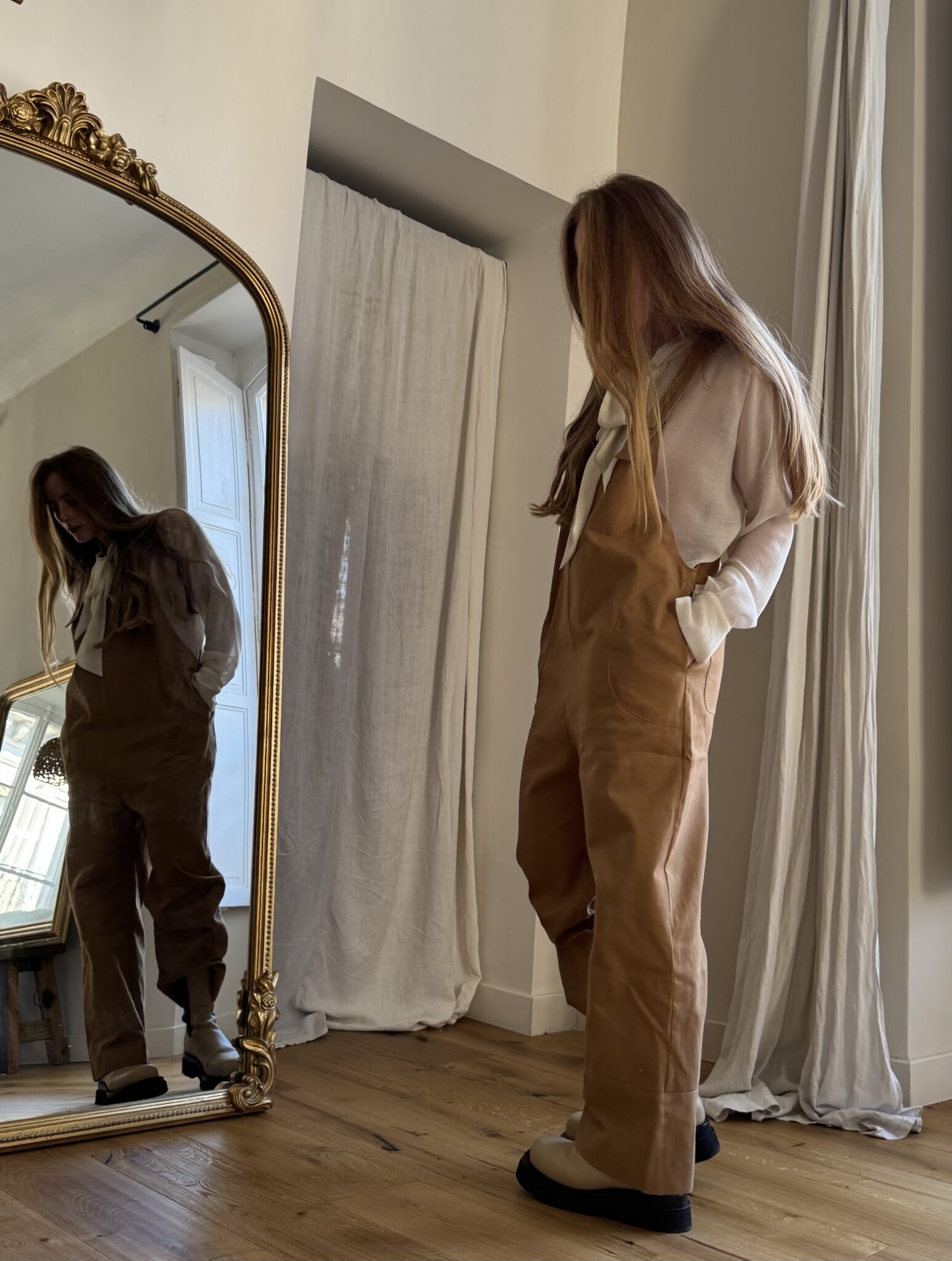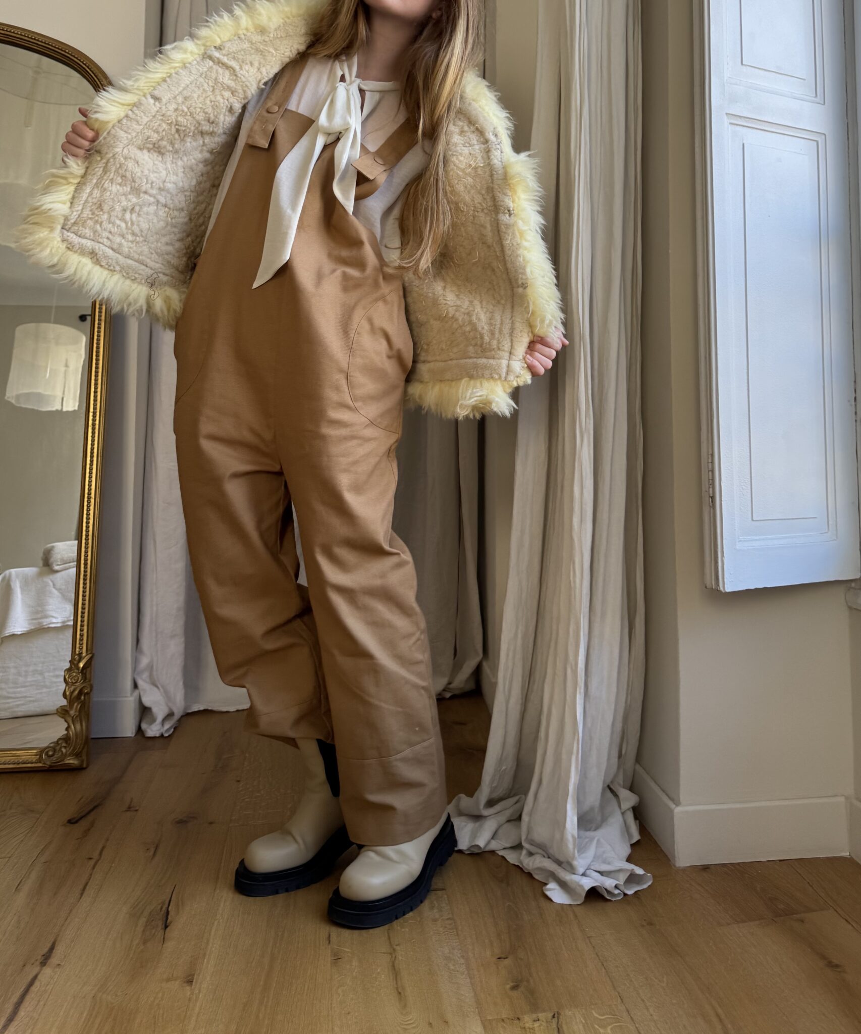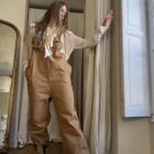 Salopette « LOUISON » en gabardine de coton calé, poches latérales & poches arrières, bretelles réglables. Une coupe japonisante et minimaliste. PIÈCE UNIQUE