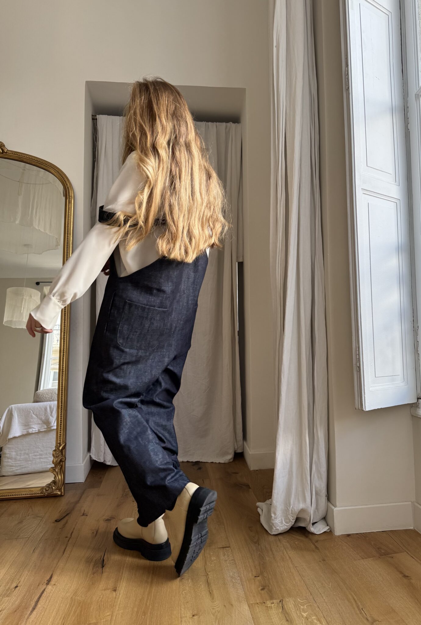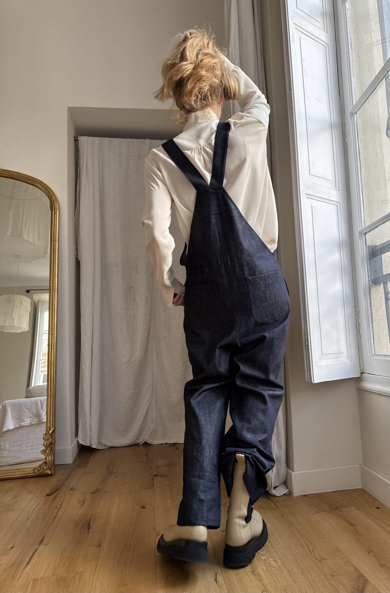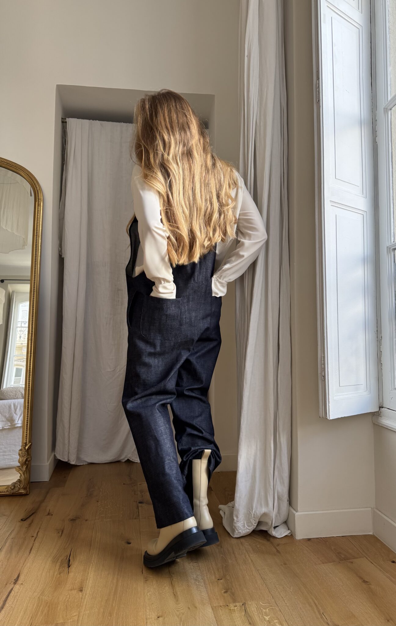 Salopette « LOUISON » en jean brut, poches latérales & poches arrières, bretelles réglables. Une coupe japonisante et minimaliste. PIÈCE UNIQUE
