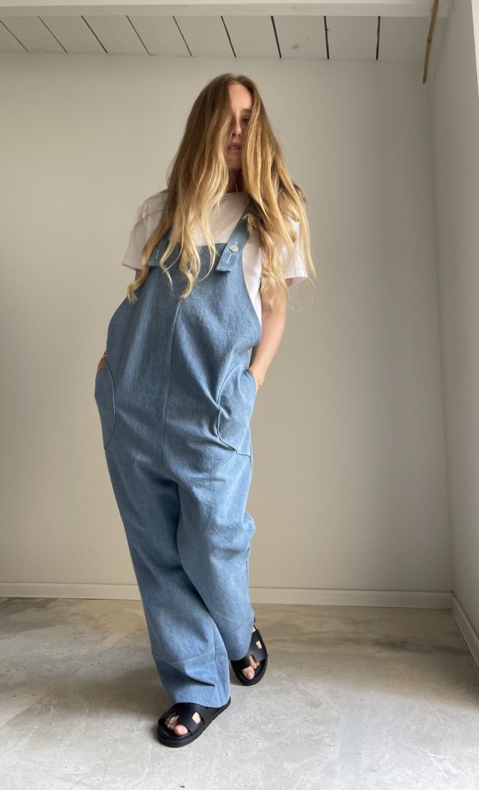 Salopette « LOUISON » en jean, bretelles réglables avec boutons en nacre, poches latérales & poches plaquées arrières. Une coupe loose et minimaliste. PIÈCE UNIQUE