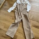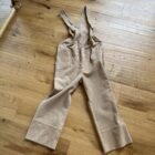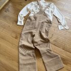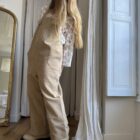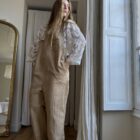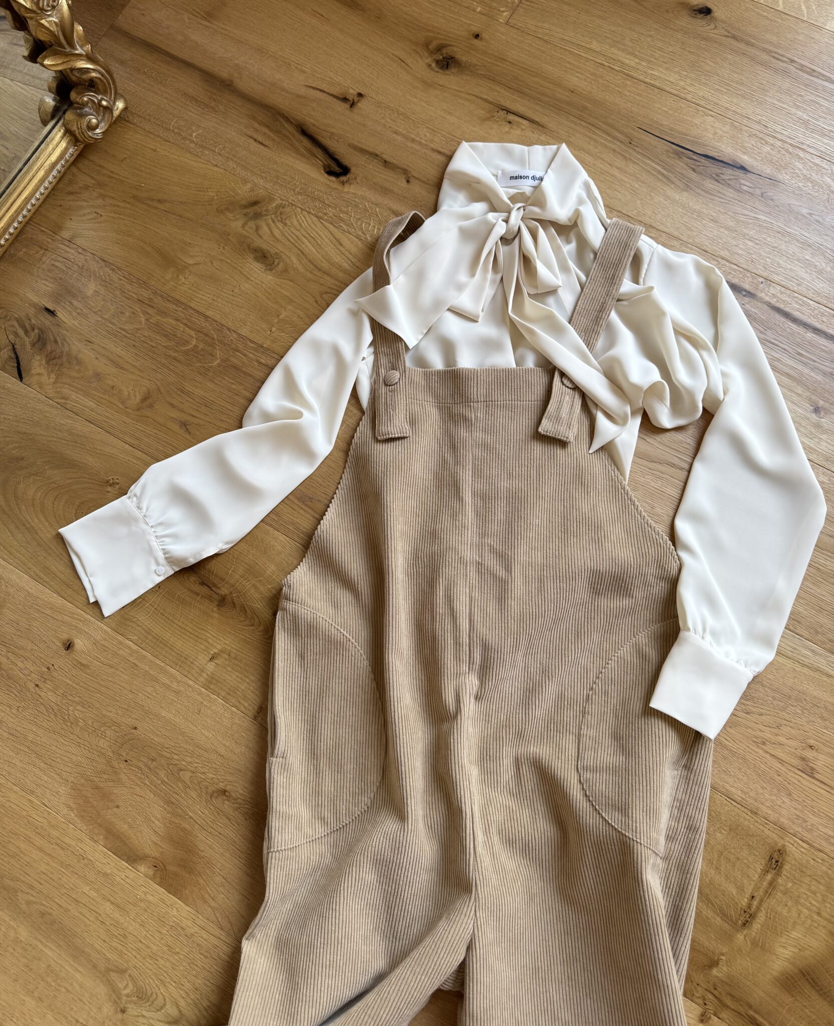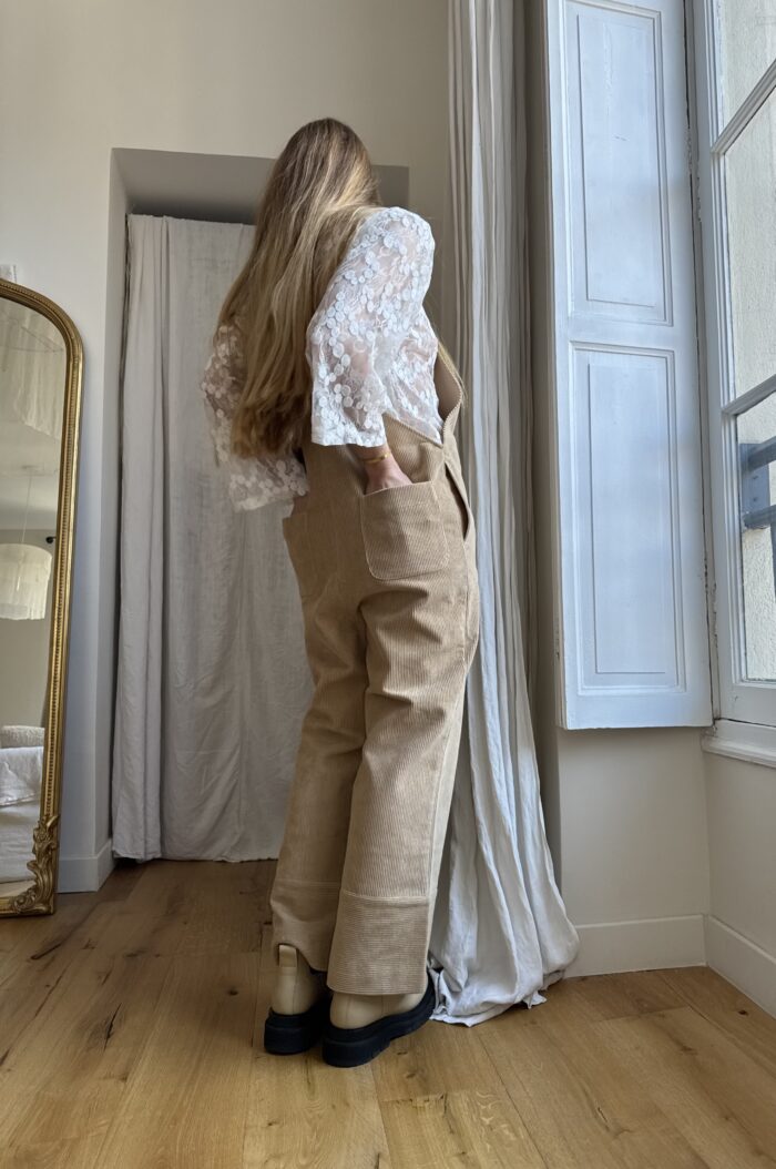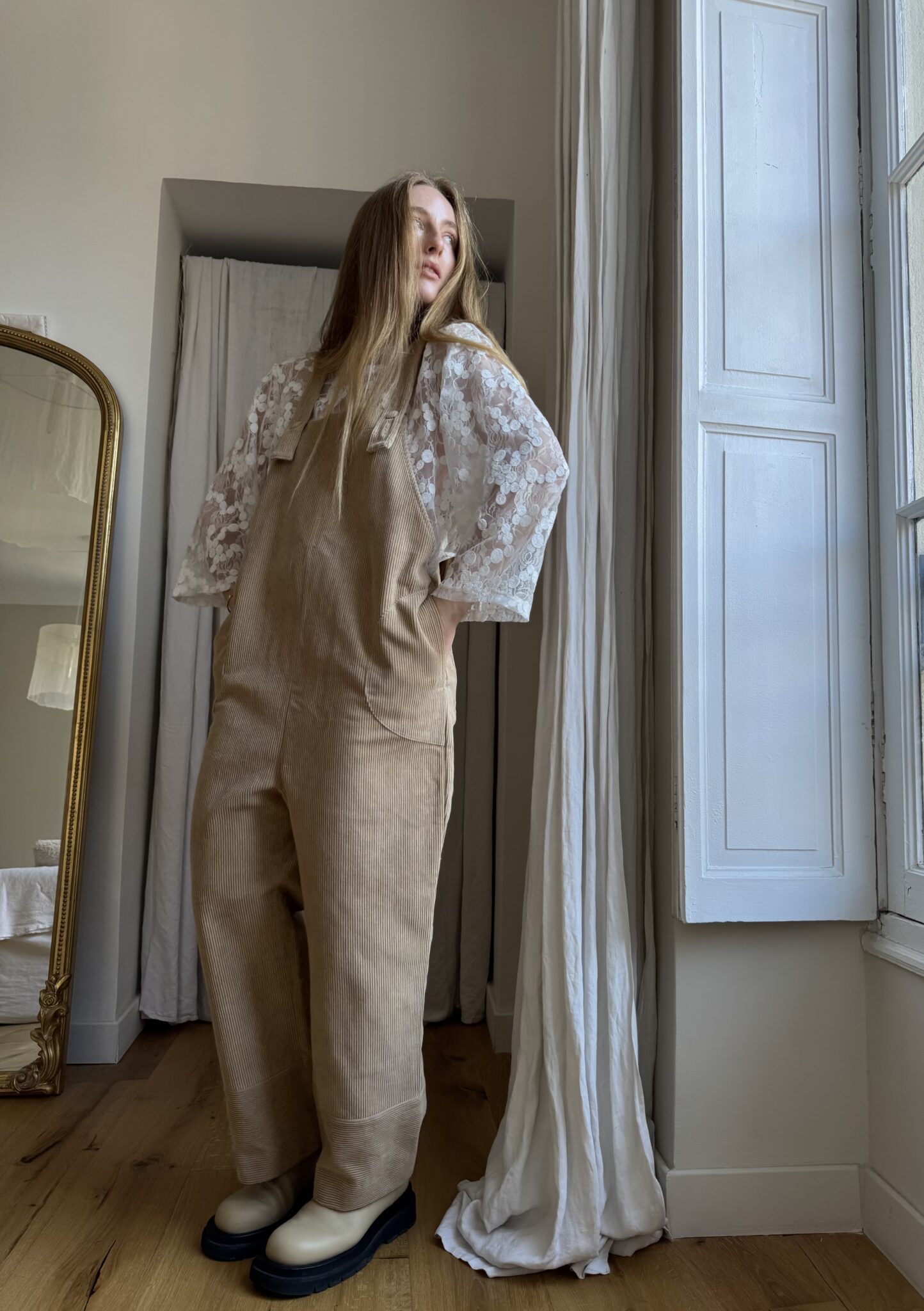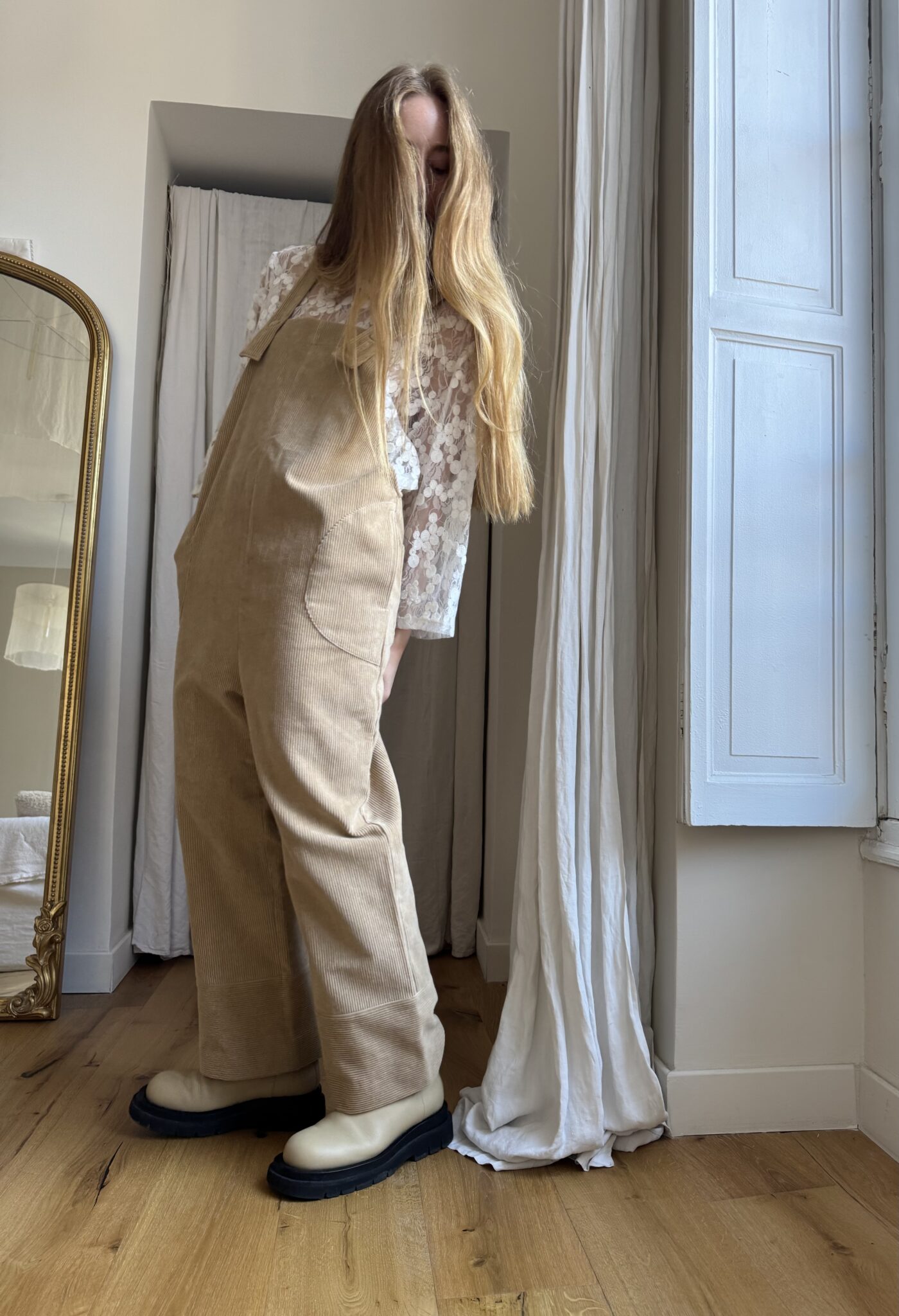 Salopette « LOUISON » en velours côtelé sable, poches latérales & poches arrières, bretelles réglables. Une coupe japonisante et minimaliste.