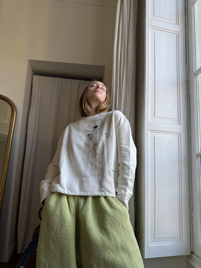 Sweat-shirt en coton molleton écru brodé à la main. Une coupe minimaliste et intemporelle. PIÈCE UNIQUE