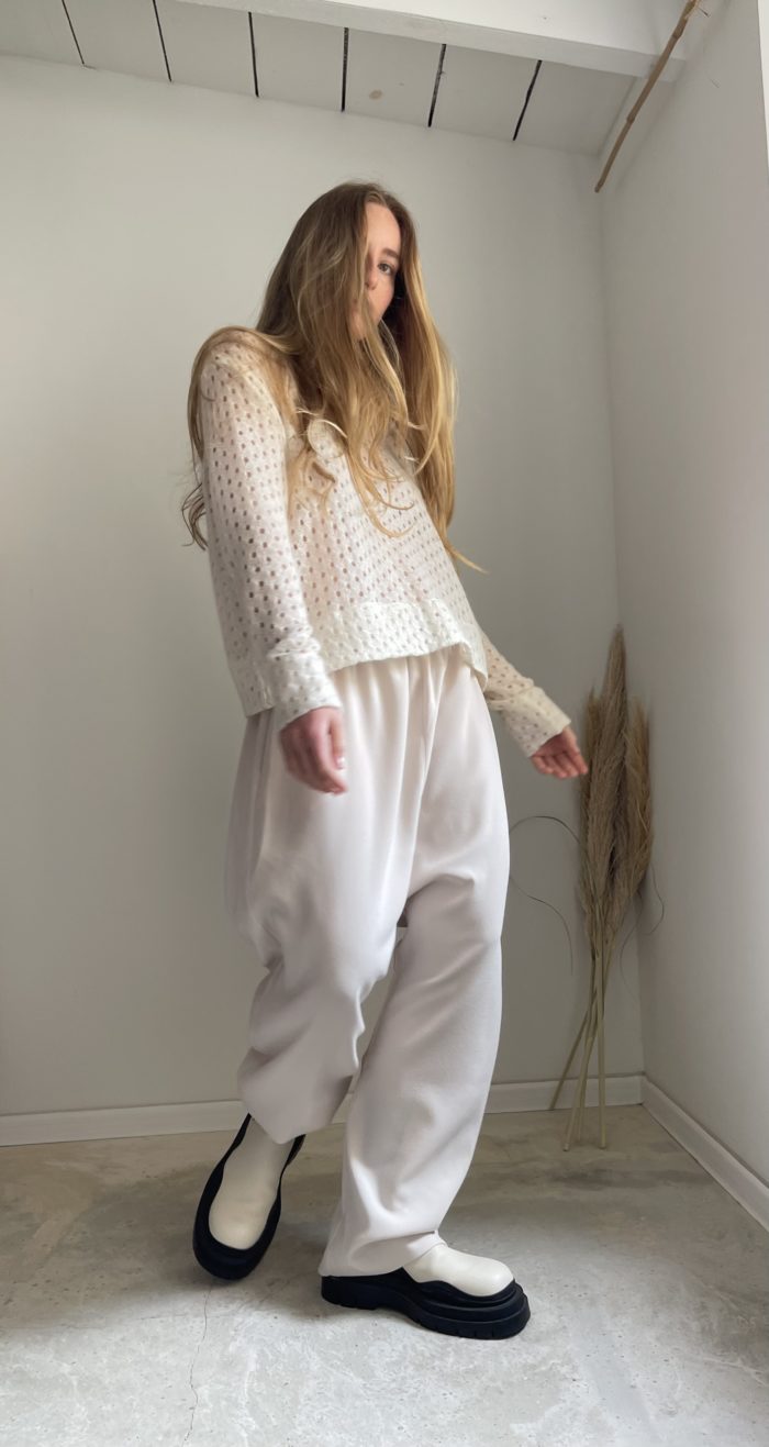 Sweat-shirt en maille tricotée ajourée écru. Une coupe minimaliste pour une pièce intemporelle. Idéale pour le printemps ! Édition très limitée