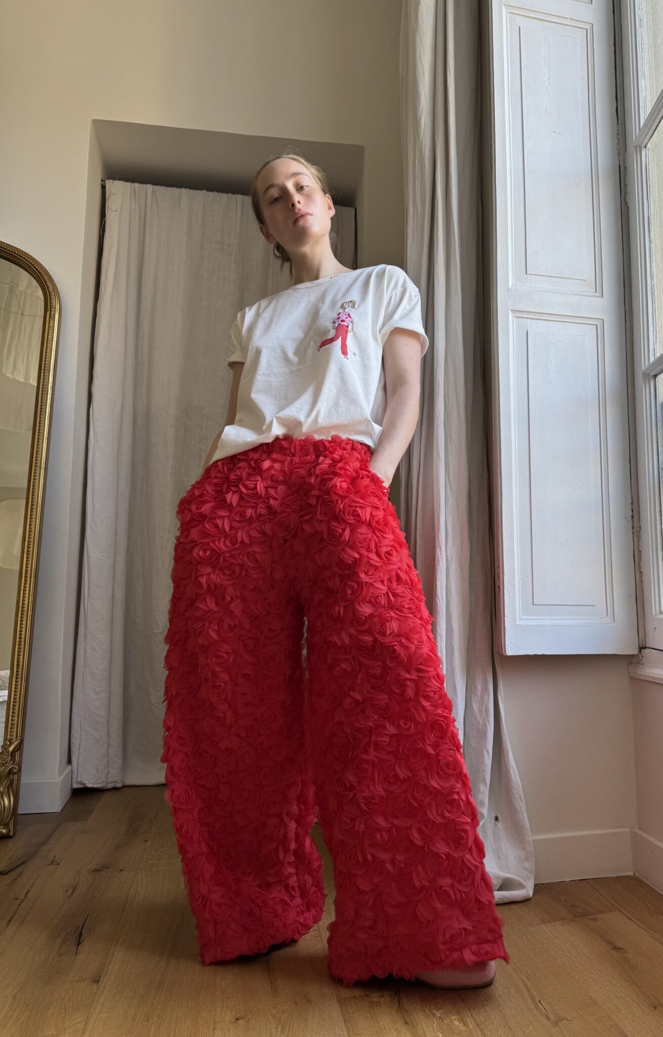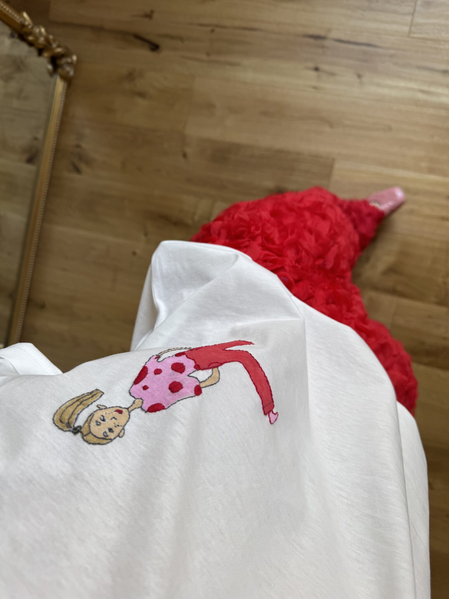 Conseils d’entretien : Lavage main à froid ou nettoyage à sec conseillé, pour ne pas détériorer les broderies. Pas de sèche linge. Repassage possible en mettant le teeshirt à l’envers et une patte mouille entre la broderie et le fer.