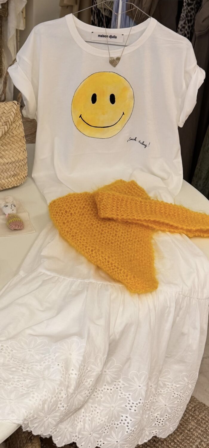 Conseils d’entretien : Lavage main à froid ou nettoyage à sec conseillé, pour ne pas détériorer les broderies. Pas de sèche linge. Repassage possible en mettant le teeshirt à l’envers.