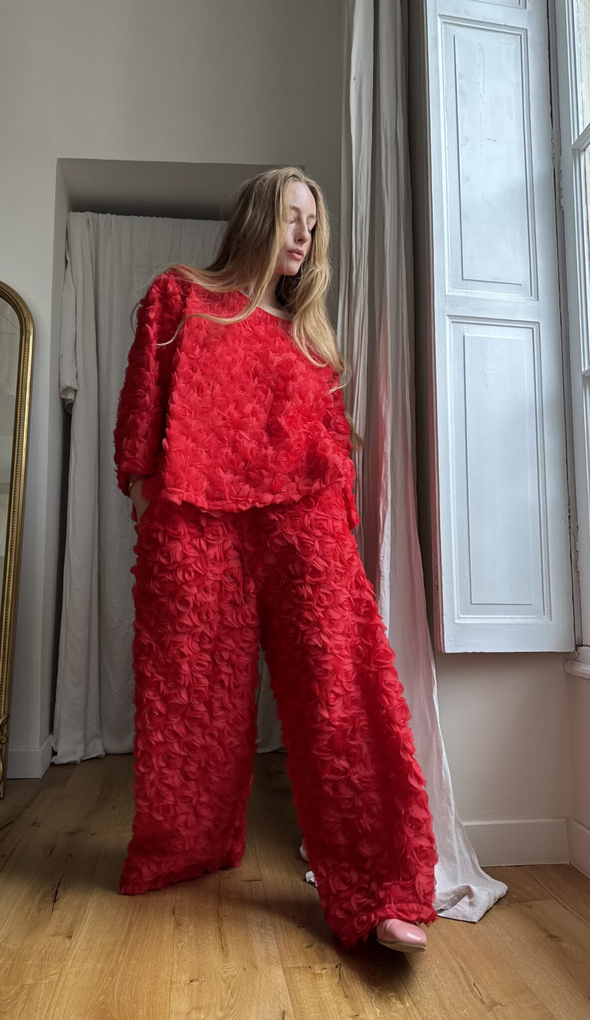 Teeshirt « LUCIEN » dans un sublime tulle parsemé de roses rouges. Une coupe loose et minimaliste, style japonisant, manches 3/4, col rond, une pièce stylée et unique.