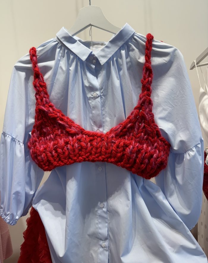 Top / soutien-gorge tricoté main en laine. L’accessoire mode original qui ajoute la petite touche de couleur à votre tenue. Le top est présenté ici sur le chemisier « ÉLISE » en coton. PIÈCE UNIQUE