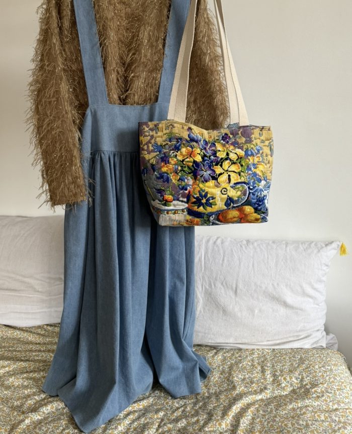 Tote bag « CLAUDETTE » en tapisserie canevas, bi-matière, entièrement fait main. Verso du sac en jean, brodé main au fil doré. Fond de sac en coton fleuri, petite poche intérieure en jean, grandes anses, pression pour fermer le sac. PIÈCE UNIQUE !