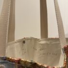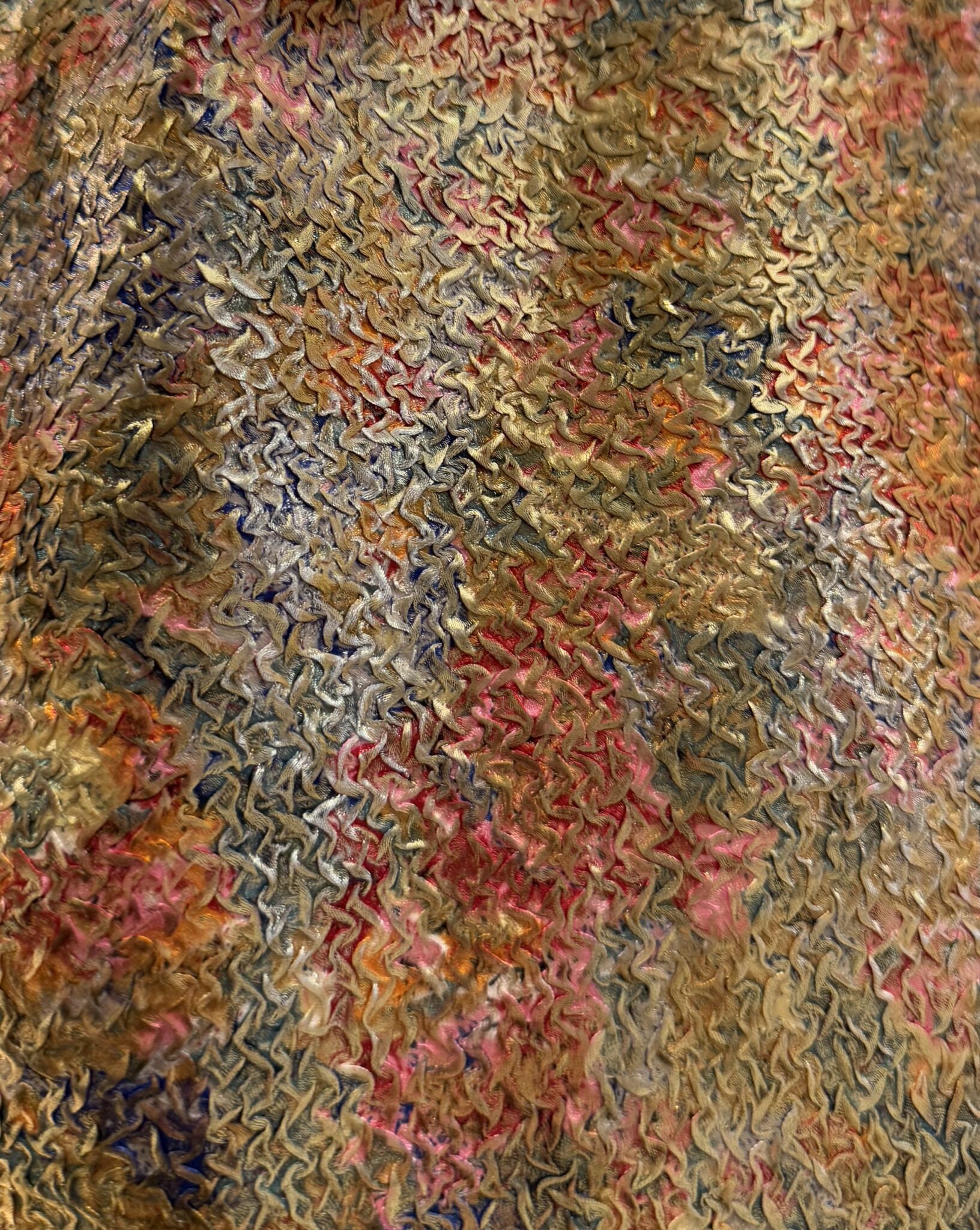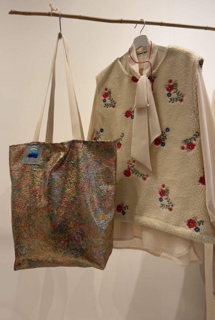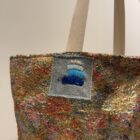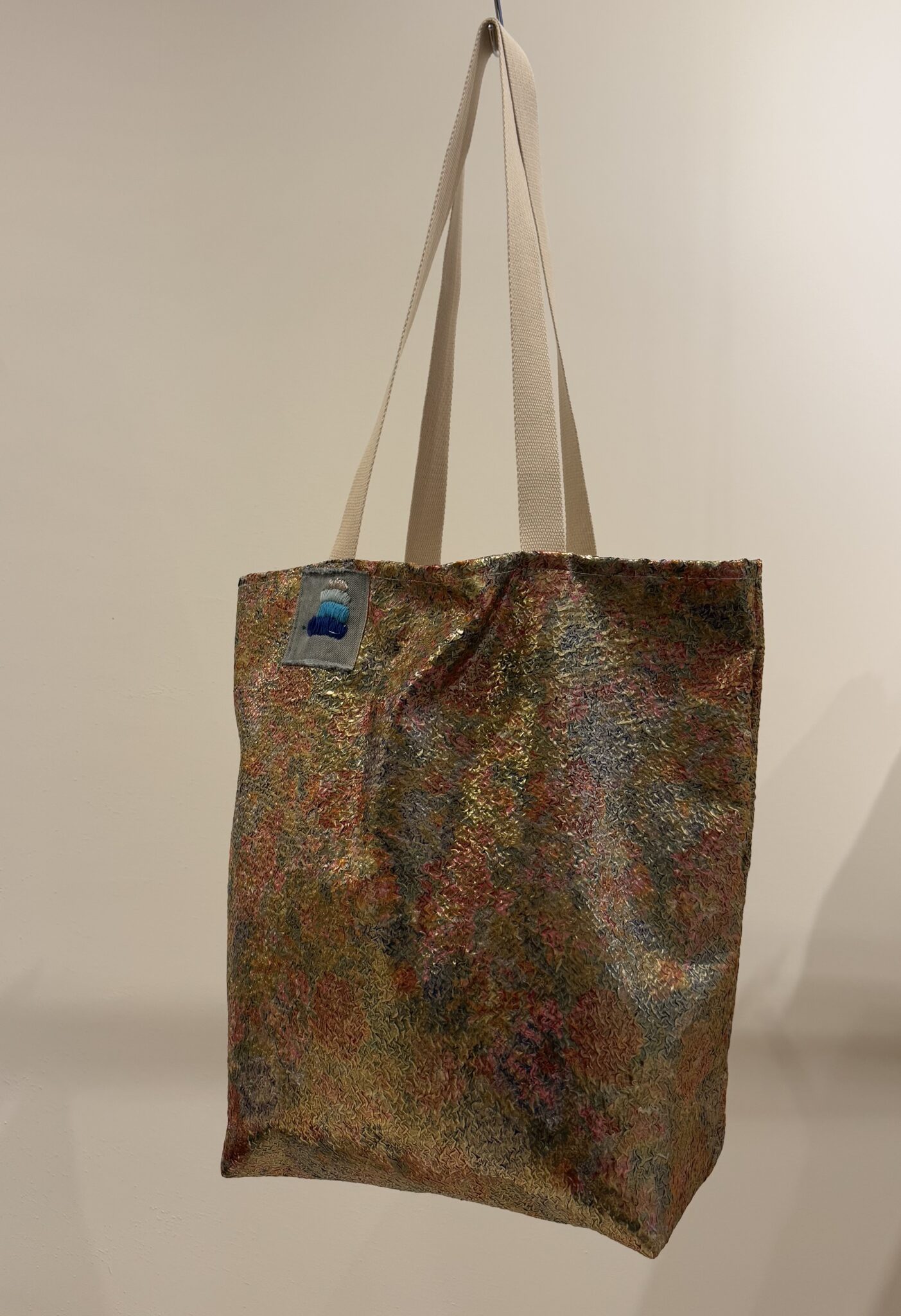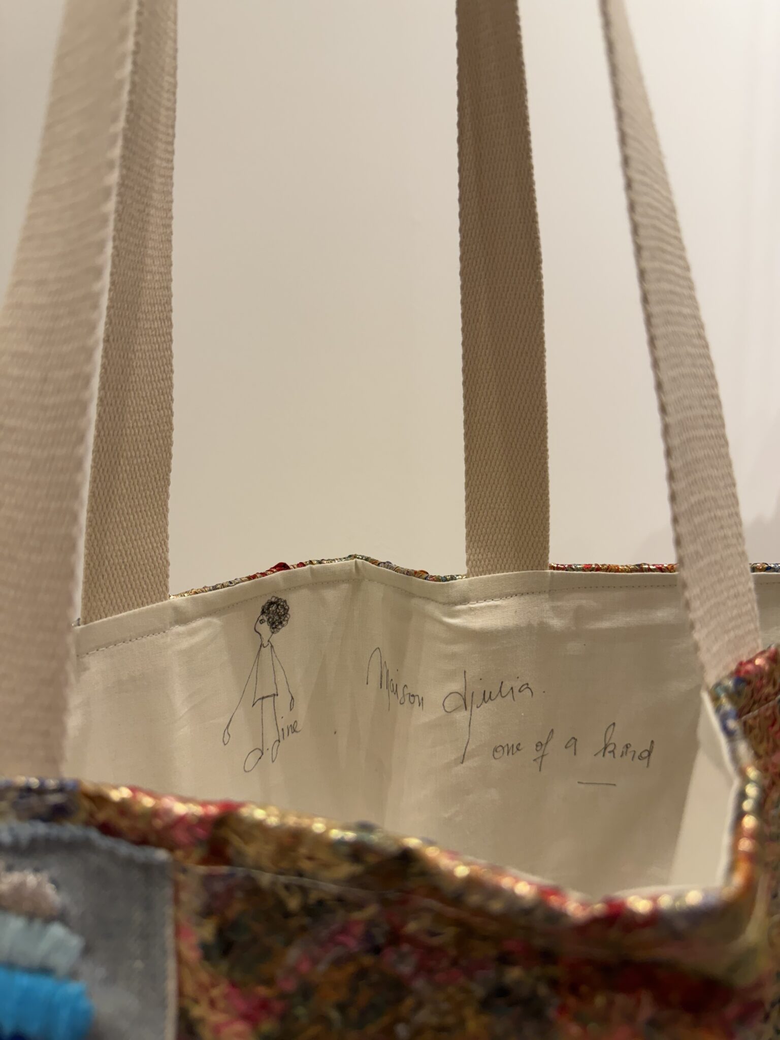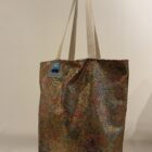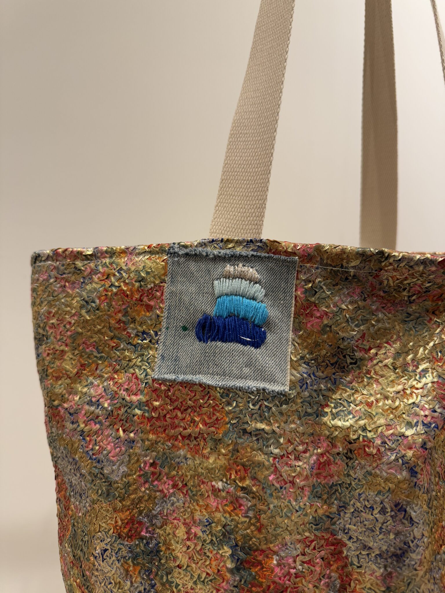 Tote bag en tissu effet ciré multicolore. Fond de sac en coton écru avec dessins faits main. Anses du sac en coton. Tote bag poétique. PIÈCE UNIQUE