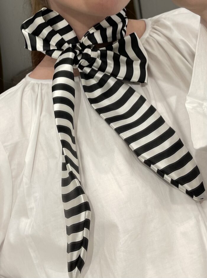 Tour de cou, foulard ou ceinture, c’est comme vous le souhaitez ! En taffetas de soie rayé, la petite touche élégante à apporter à votre tenue ! Fait main. PIÈCE UNIQUE  !
