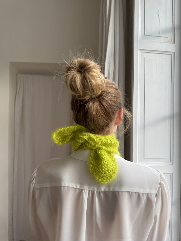 Tour de cou tricoté main en kid mohair coloris vert chartreuse & fil lurex à sequins dorés. Doux tel un câlin. PIÈCE UNIQUE