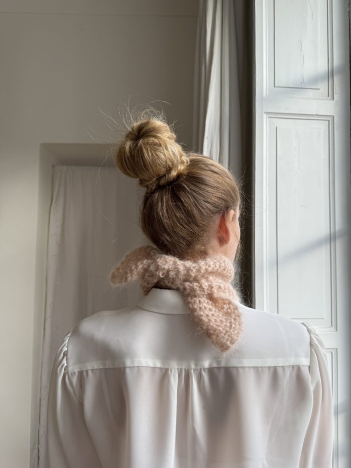 Tour de cou tricoté main en kid mohair coloris rose coquille d’œuf. Doux tel un câlin. PIÈCE UNIQUE