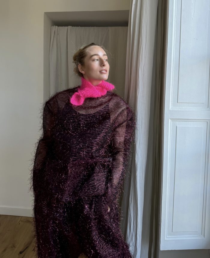Tour de cou tricoté main en kid mohair rose fluo. Doux tel un câlin. PIÈCE UNIQUE