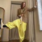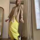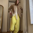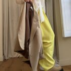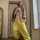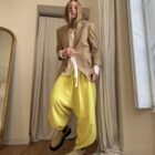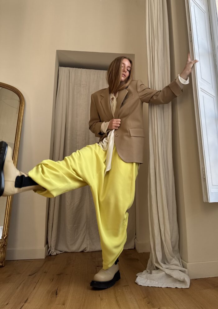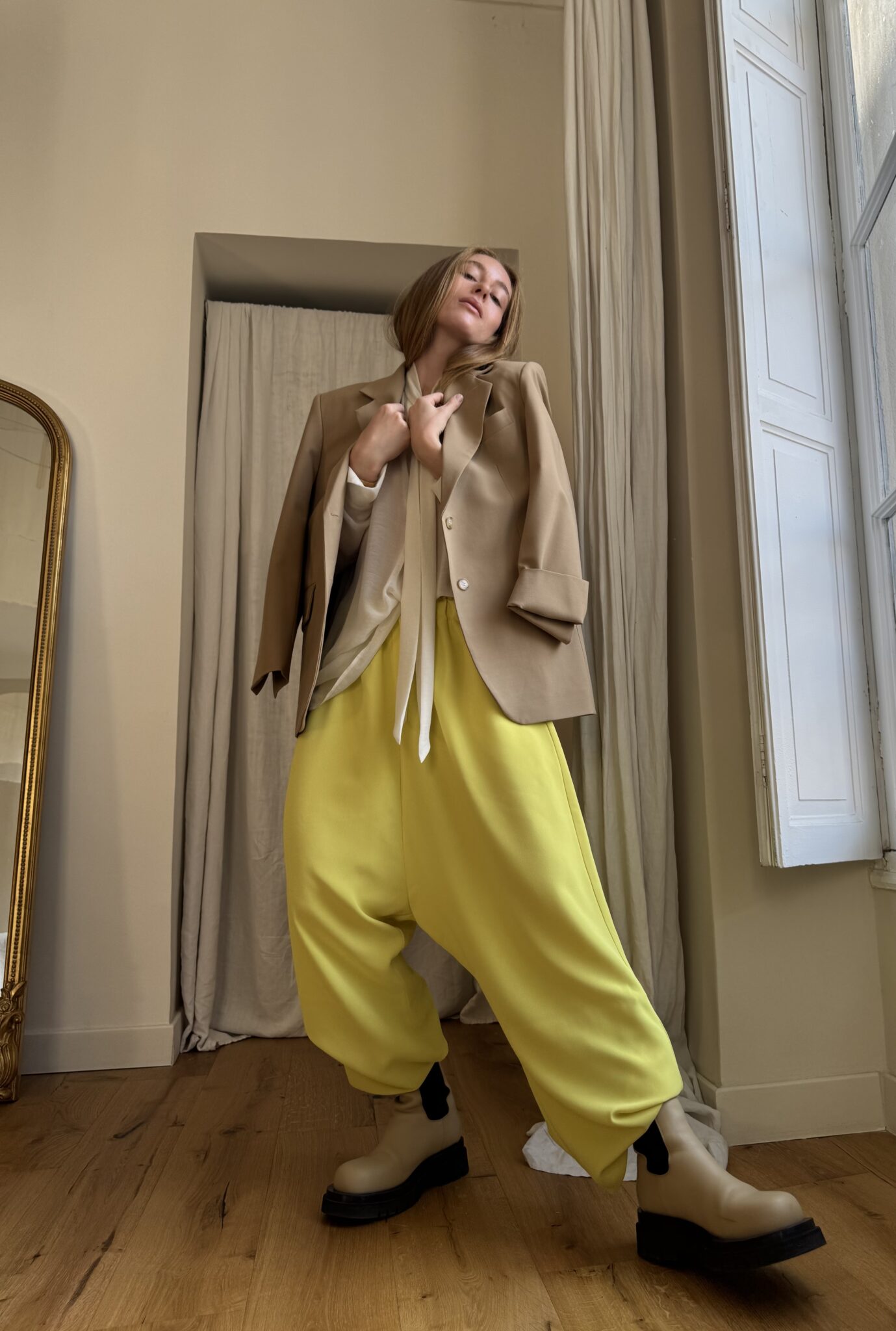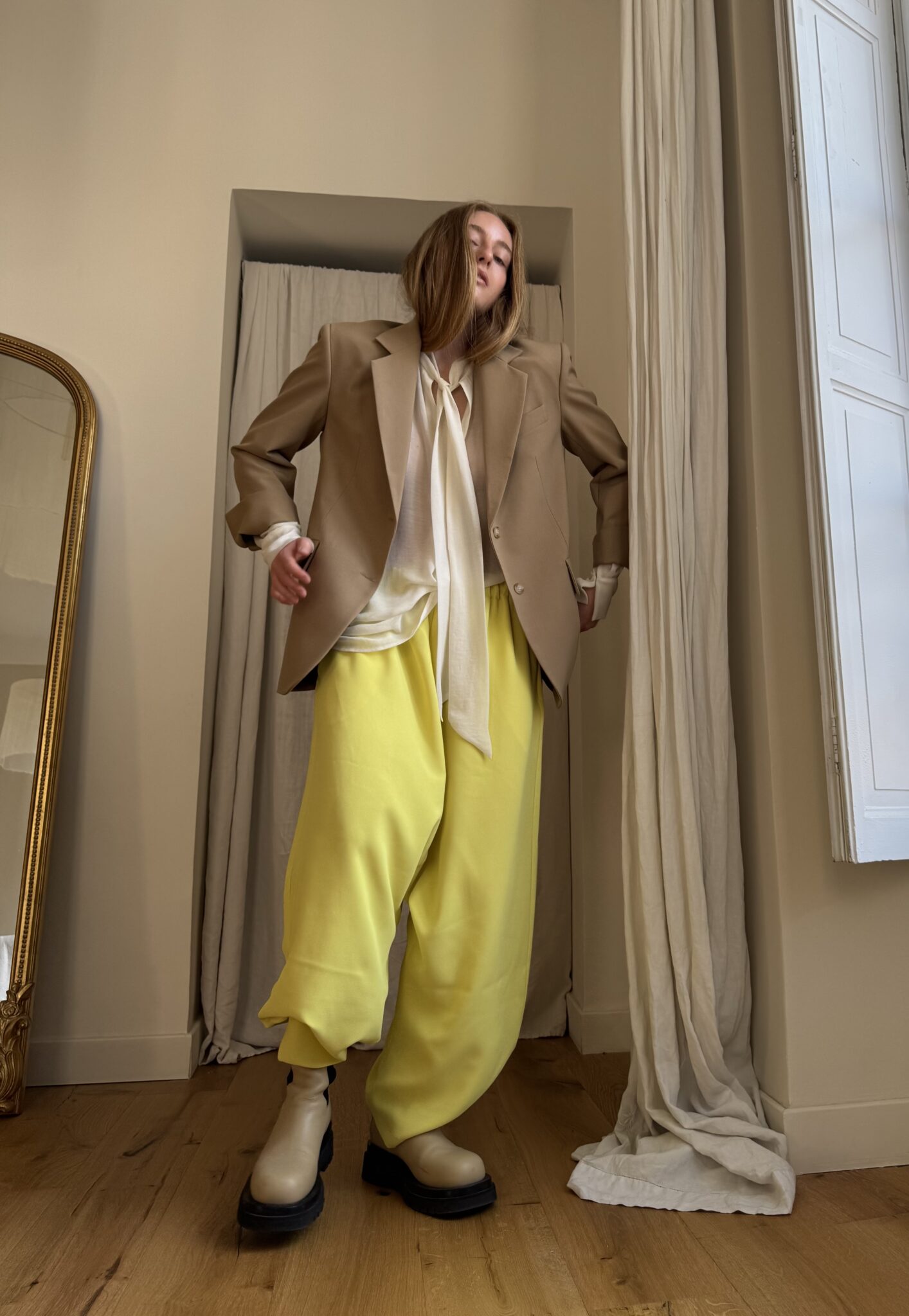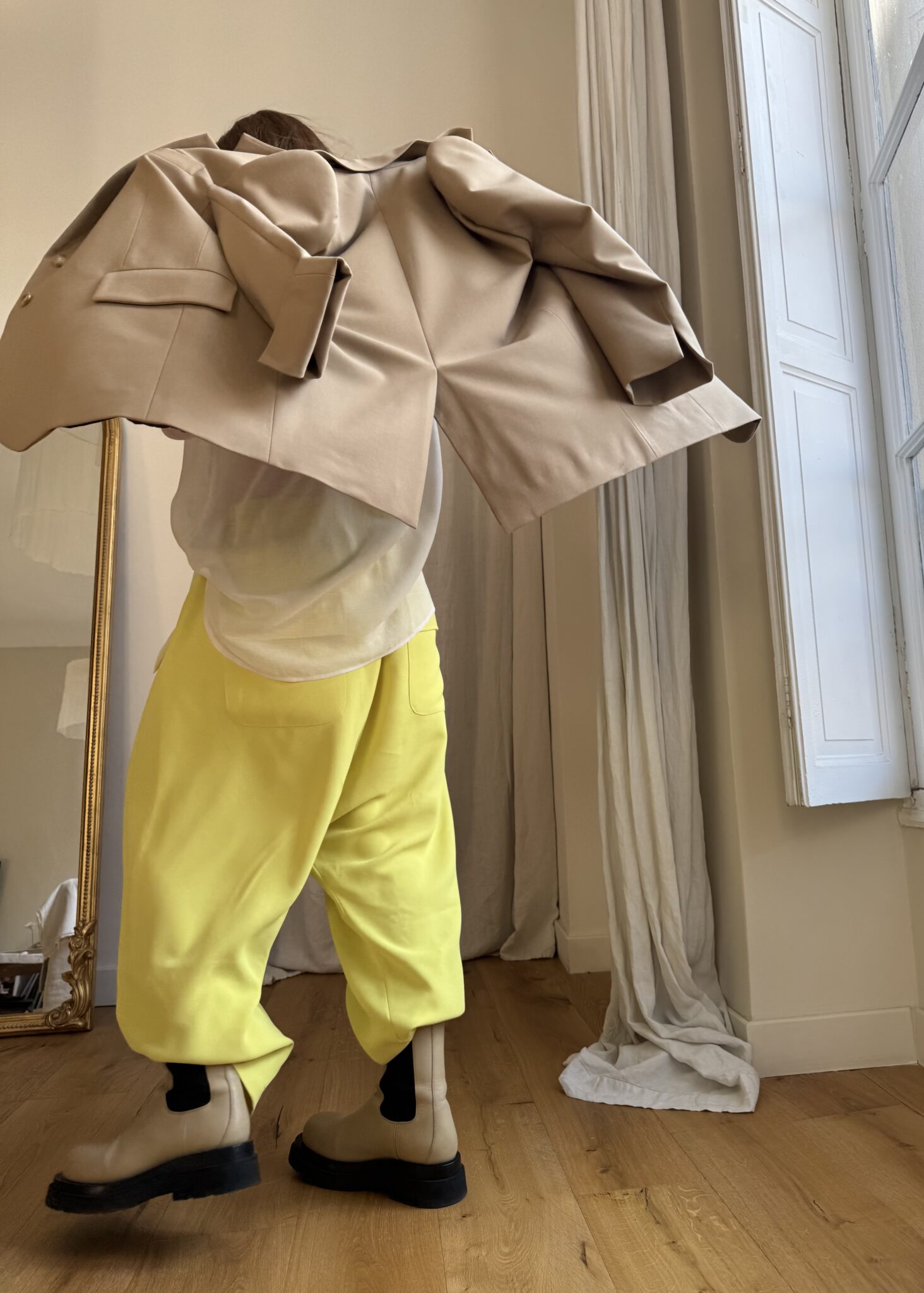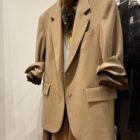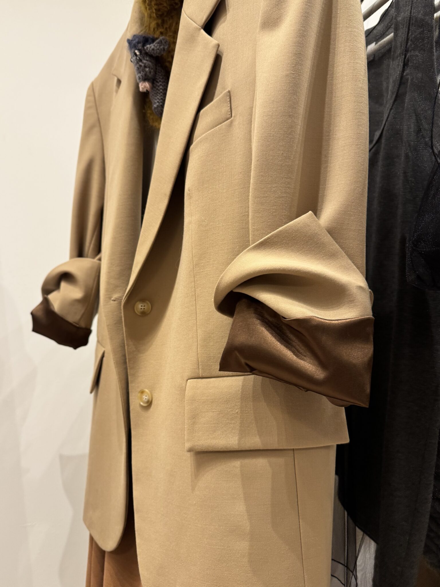 Veste Blazer « LÉO » en laine & viscose beige, entièrement doublée en crêpe satiné coloris chocolat, poches à rabat, fente au dos. Veste chic et élégante. PIÈCE UNIQUE