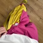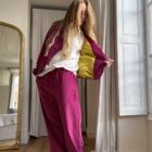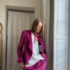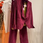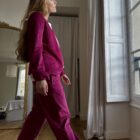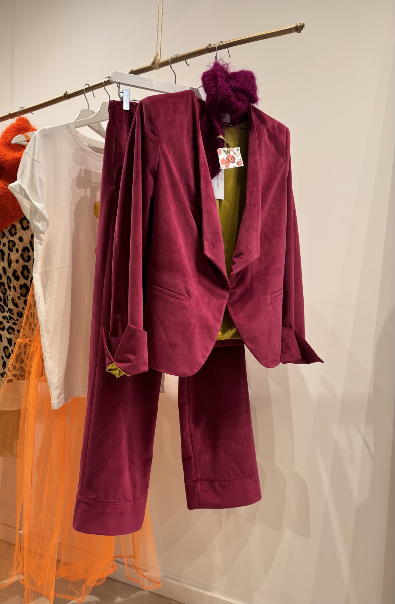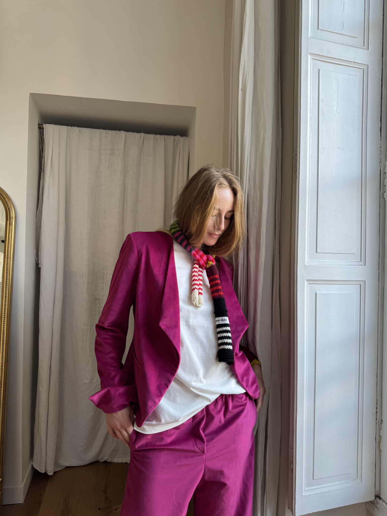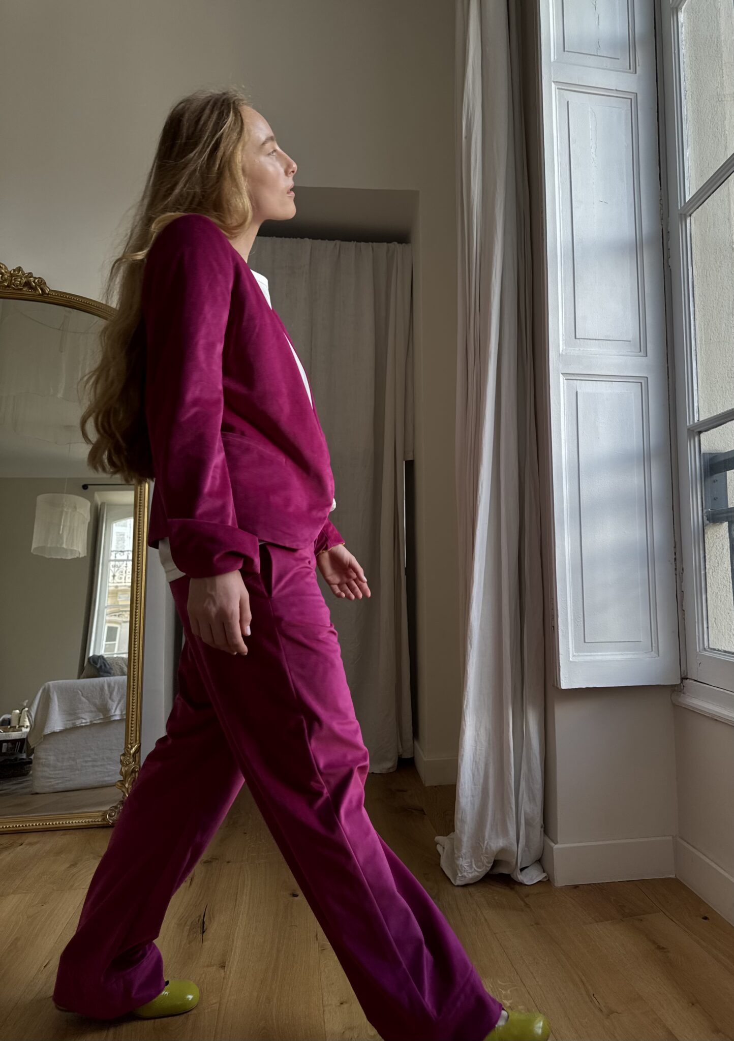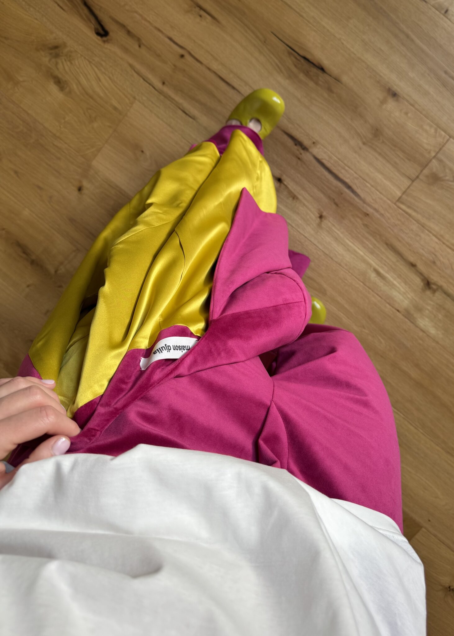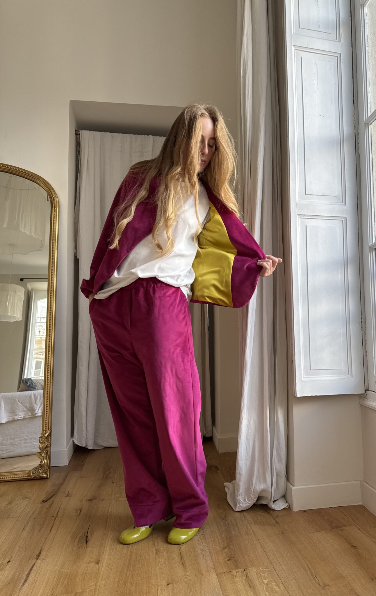 Veste Blazer « LOUISA » en velours lisse framboise, entièrement doublée en crêpe satiné coloris moutarde. Fermeture à pression. Veste chic et élégante. PIÈCE UNIQUE