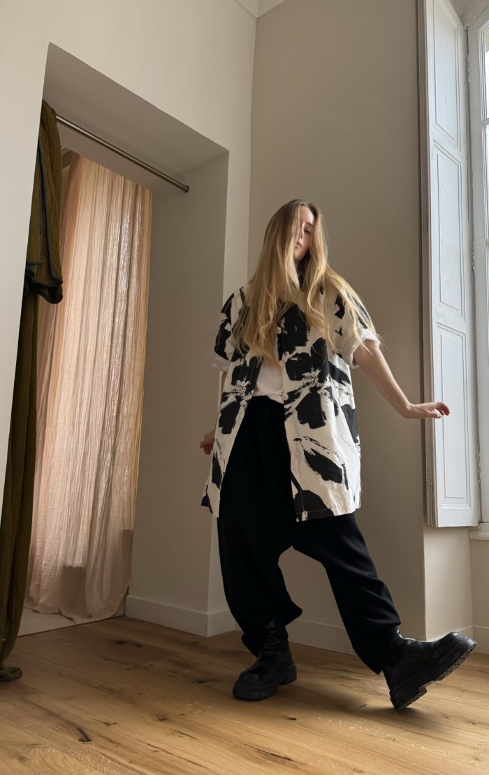 Veste « CLAUDE » en soie à fleurs. Une coupe minimaliste, oversize, à l’inspiration japonaise. Poches latérales. Veste boutonnée et entièrement doublée en soie et coton écru. Une création unique, poétique et élégante. PIÈCE UNIQUE