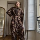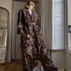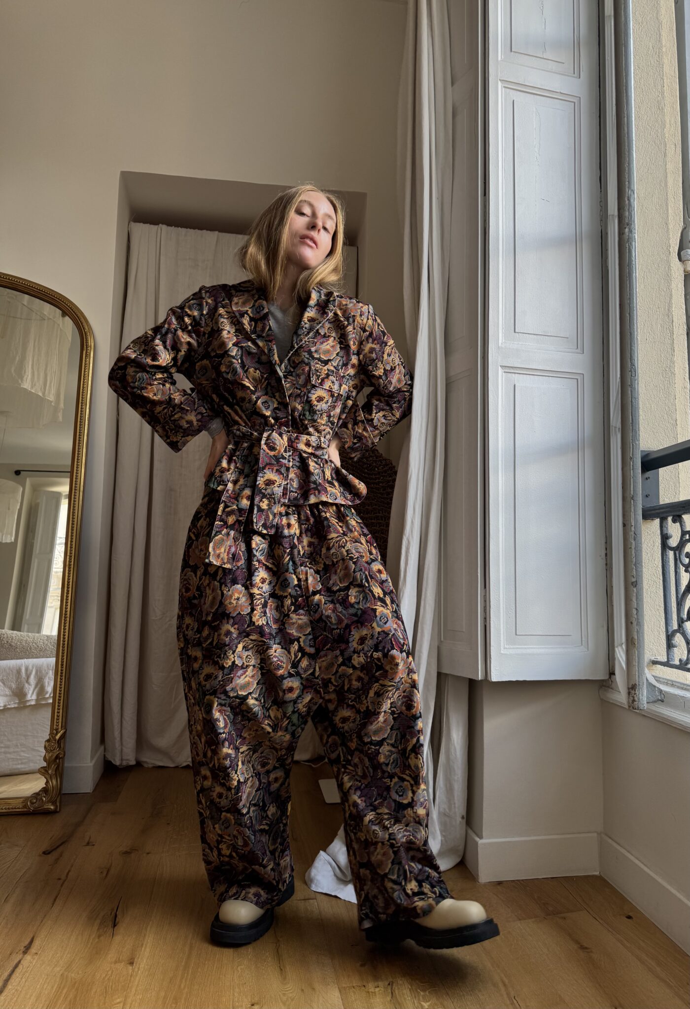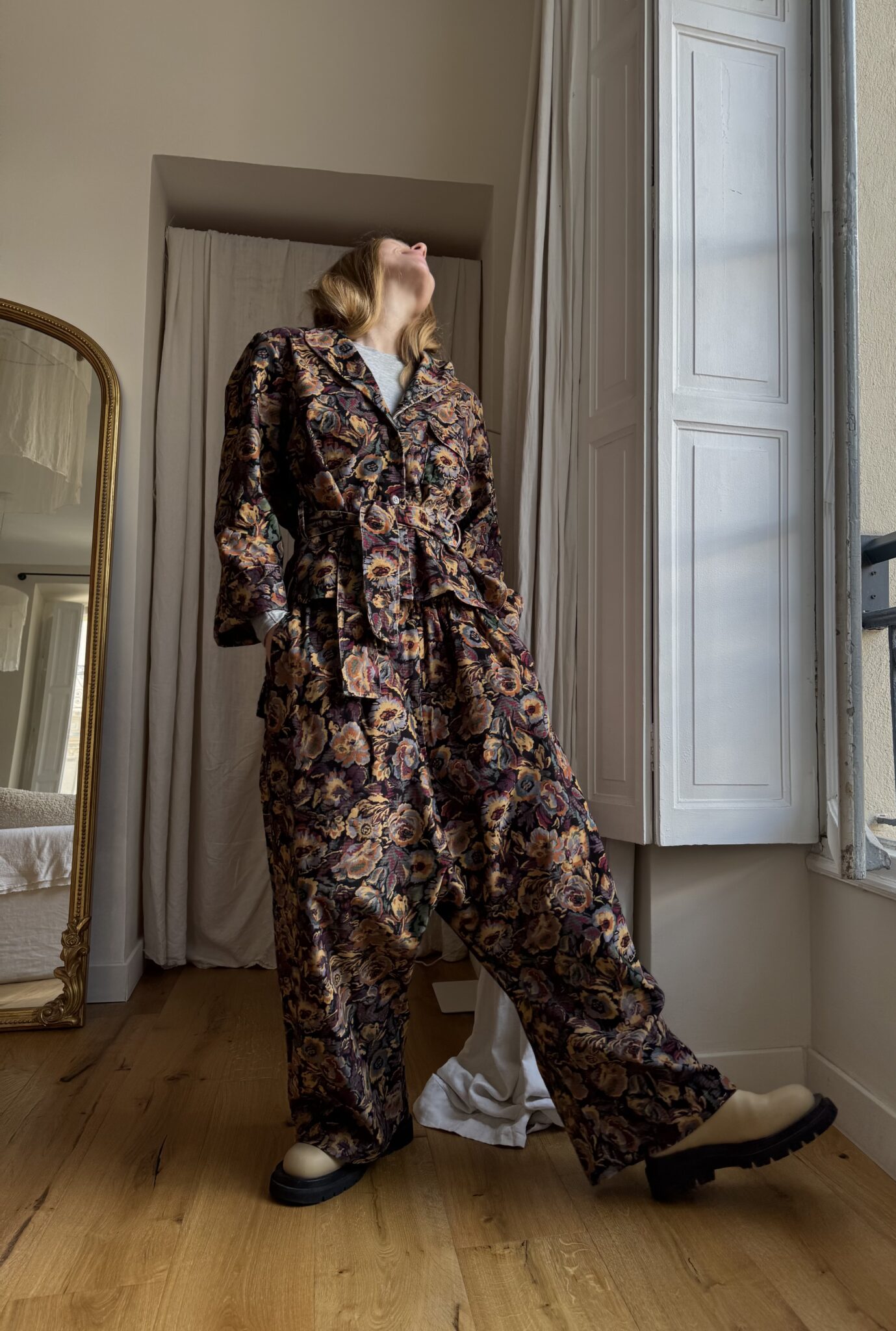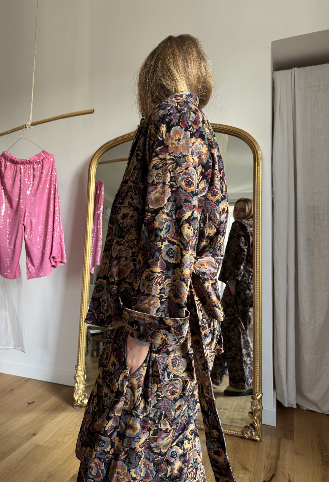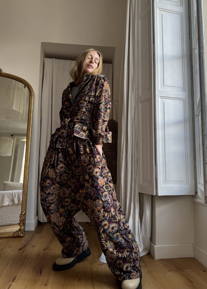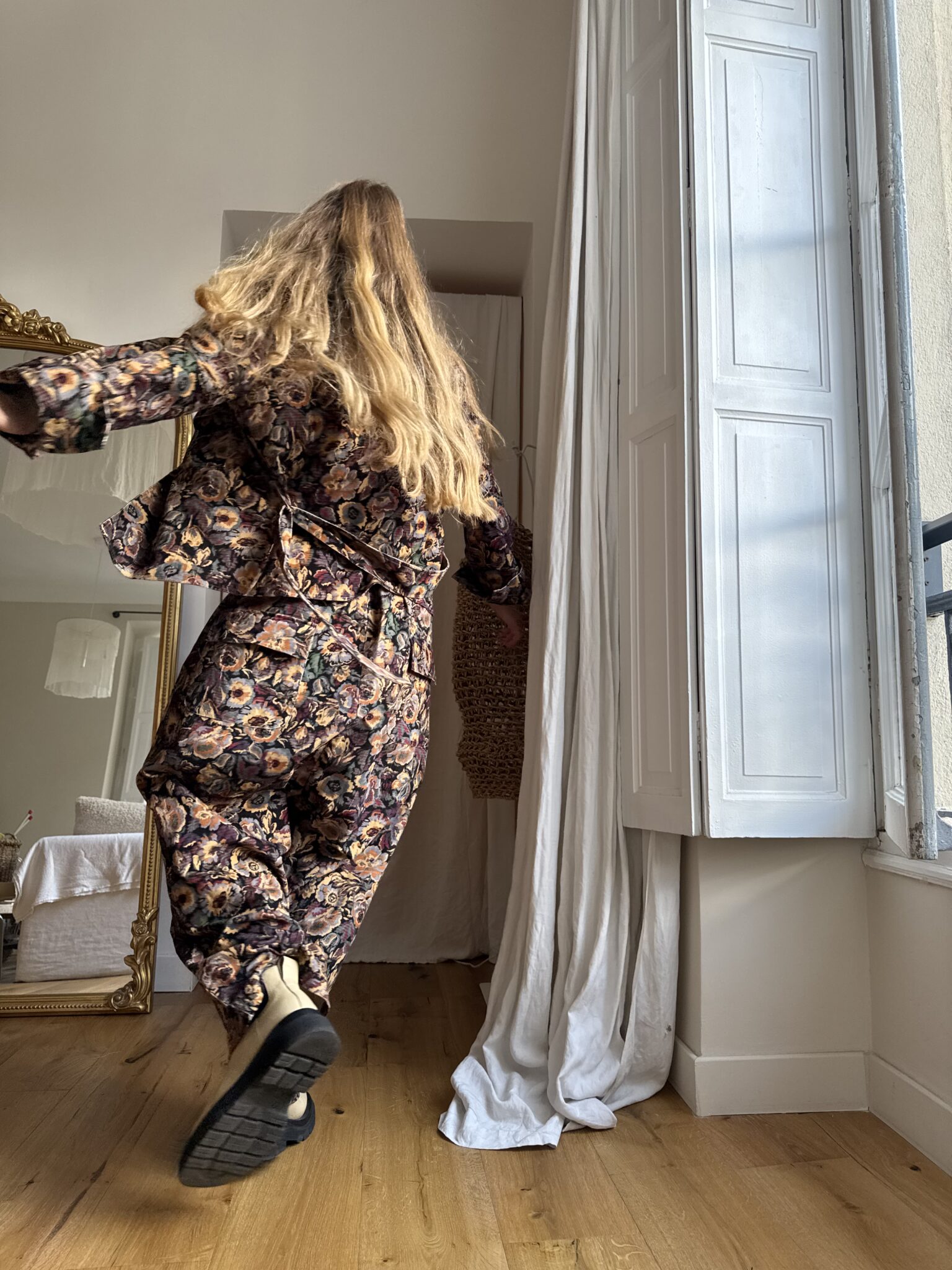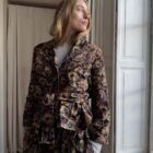 Veste « JOSIE » courte en velours milleraies fleuri, ceinture, poche plaquée à rabat, bas de veste légèrement arrondie. Veste chic et élégante.