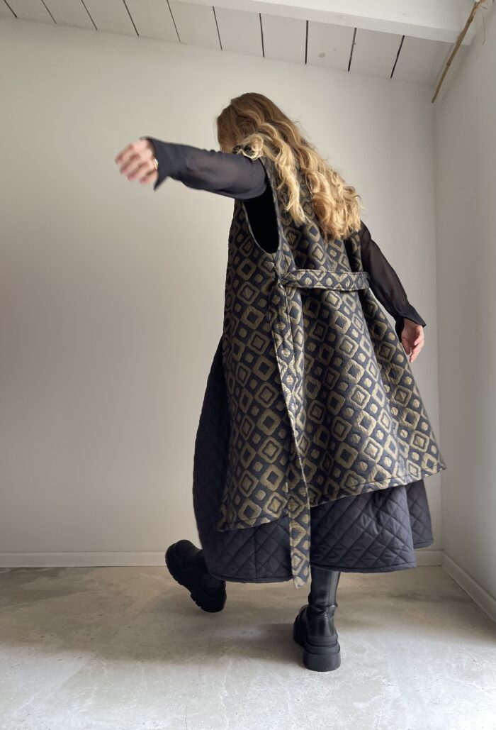 Veste longue sans manches à motifs, ceinture, poches latérales, pression au col. Une PIÈCE UNIQUE (un seul exemplaire) 🤩