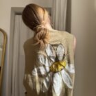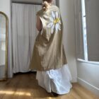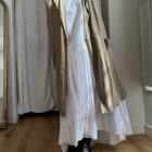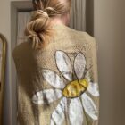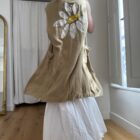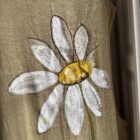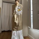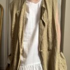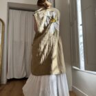 Veste longues sans manches en lin, peinte et brodée main. Poches latérales plaquées, fermeture à pressions.
