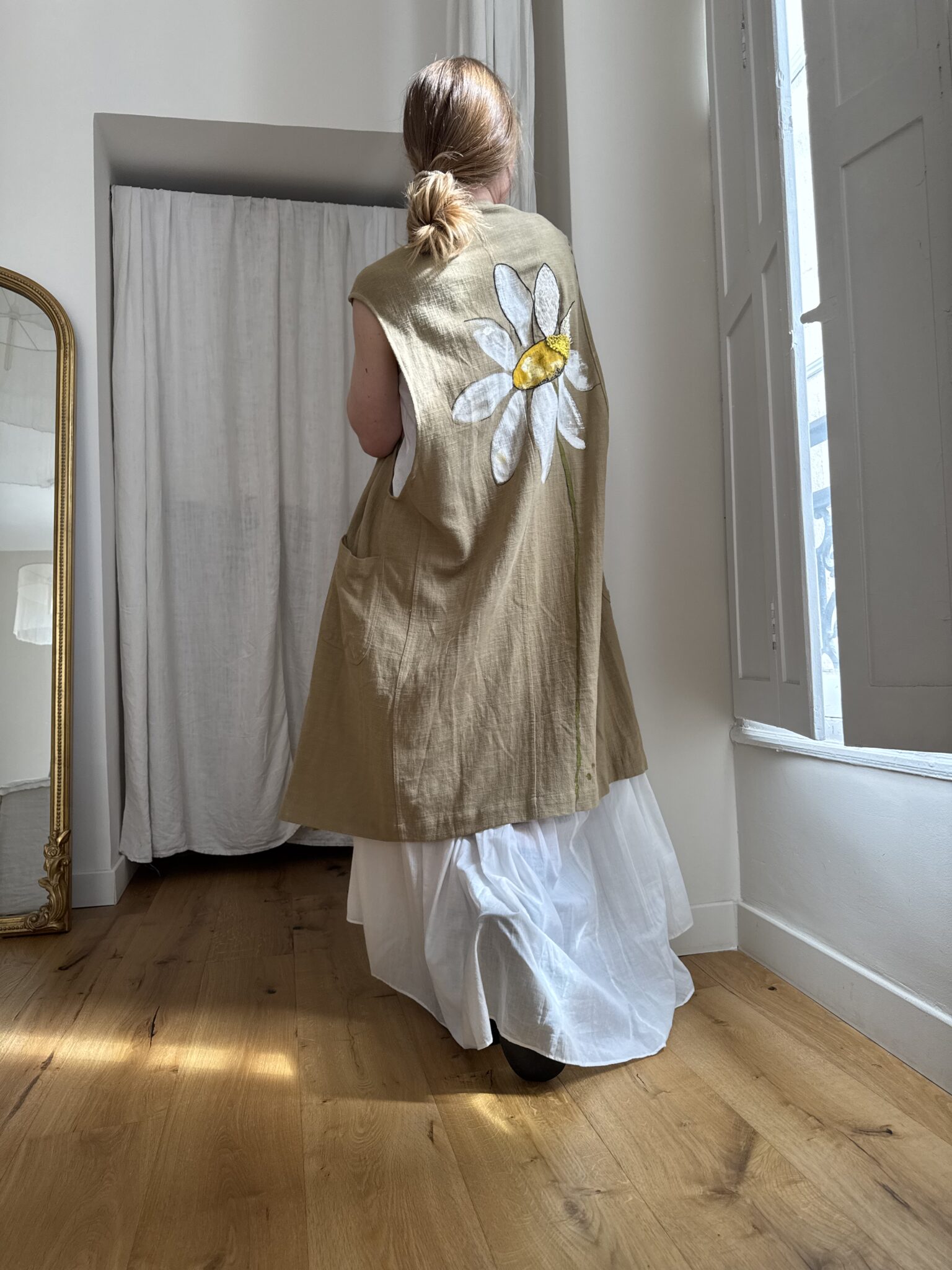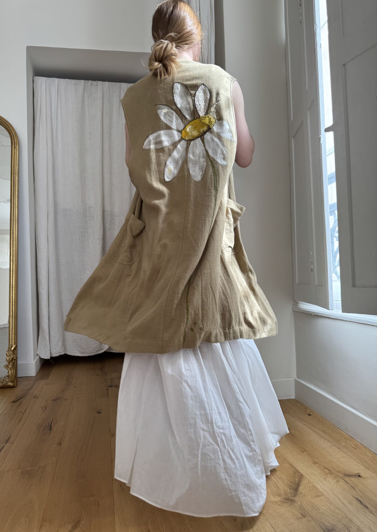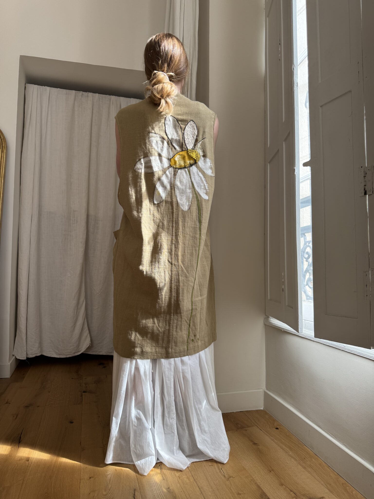 Veste longues sans manches en lin, peinte et brodée main. Poches latérales plaquées, fermeture à pressions.