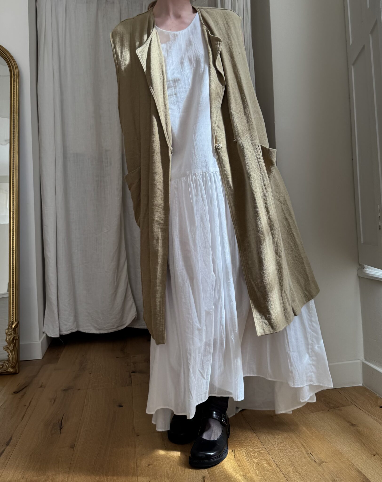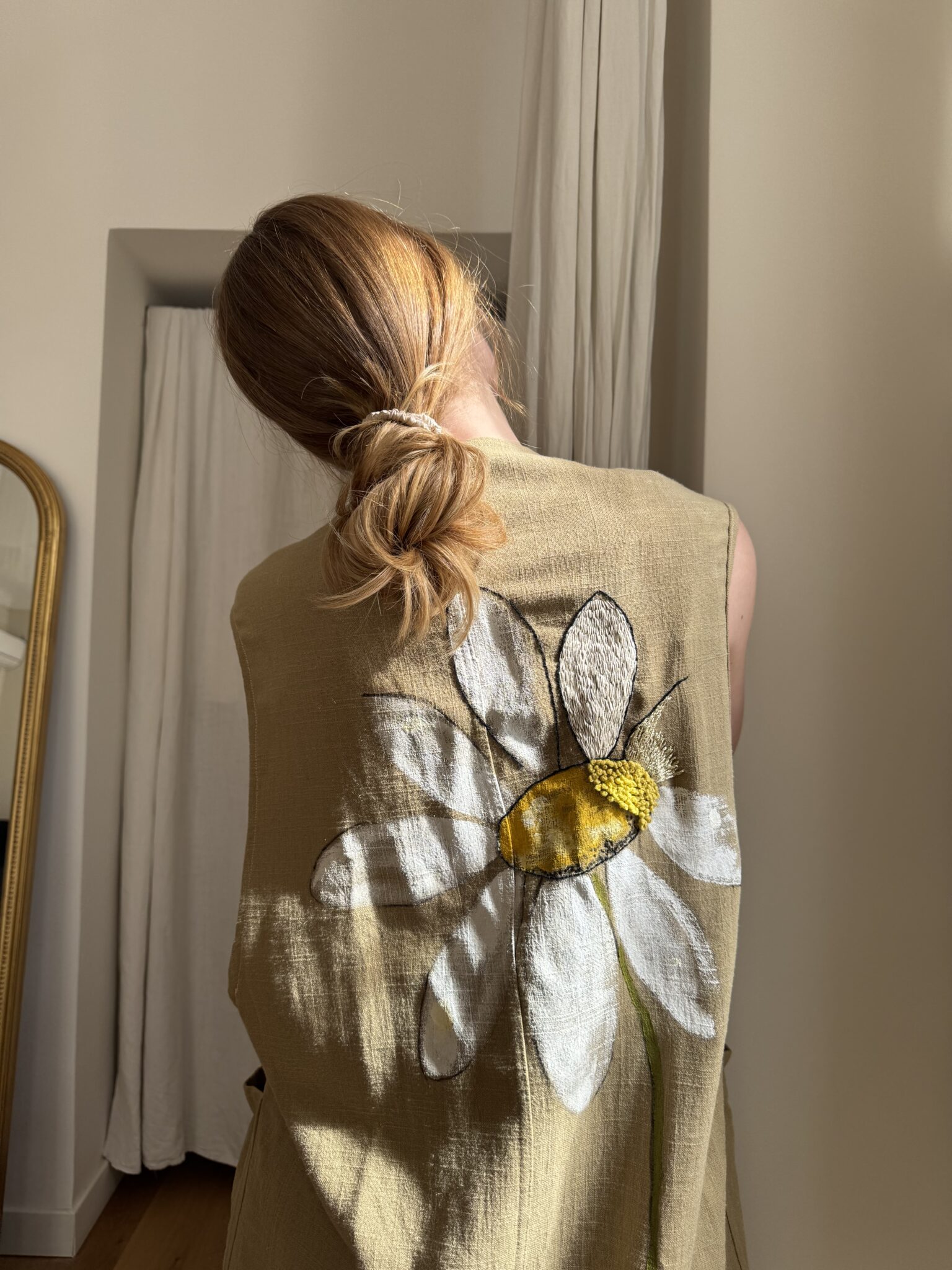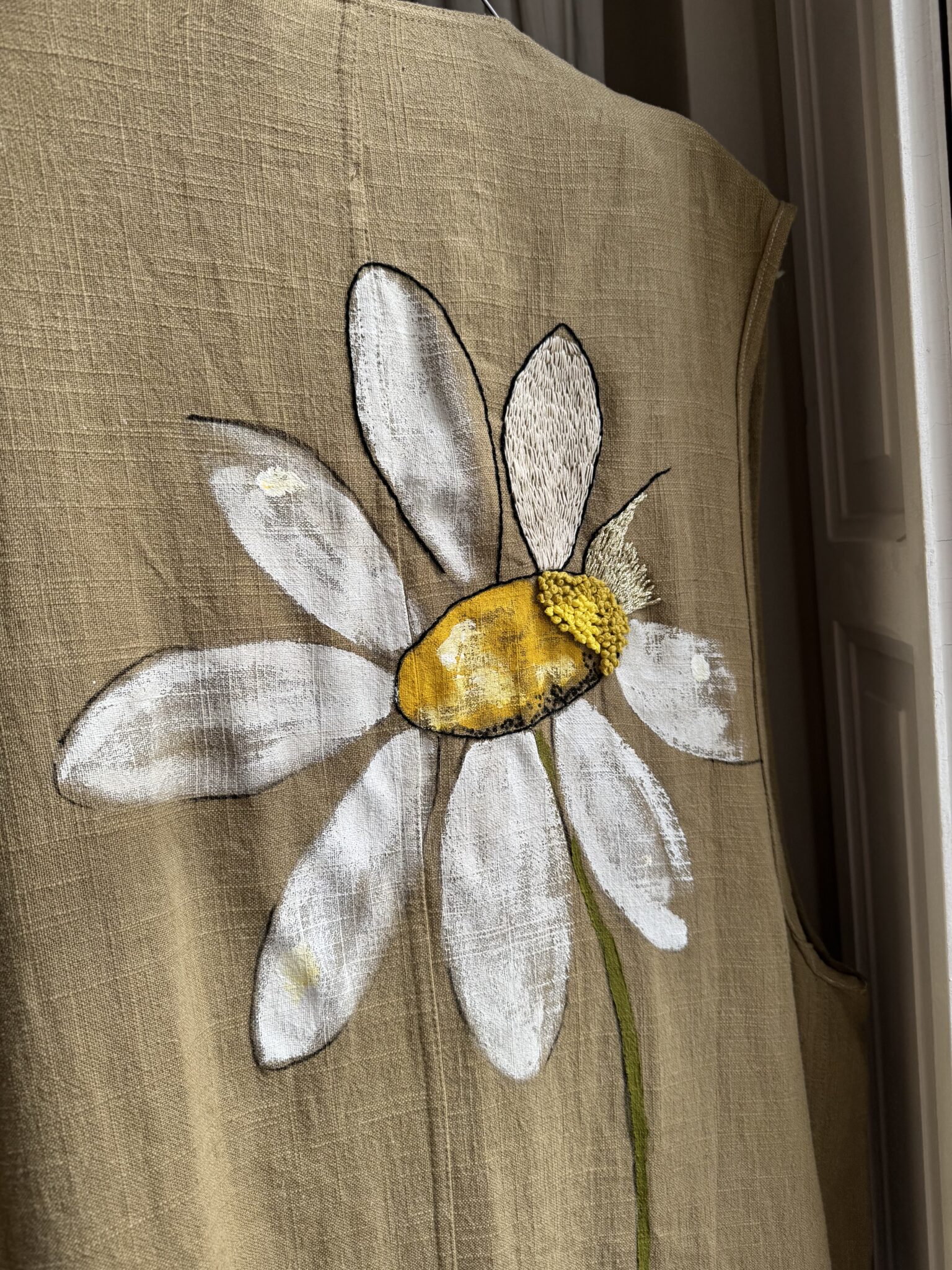 Veste longues sans manches en lin, peinte et brodée main. Poches latérales plaquées, fermeture à pressions.