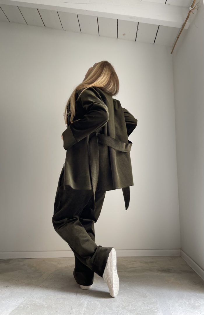 Veste en velours côtelé vert olive, ceinture, poches plaquée, bas de veste légèrement arrondie. Un velours d’exception pour une veste chic et élégante. PIÈCE UNIQUE